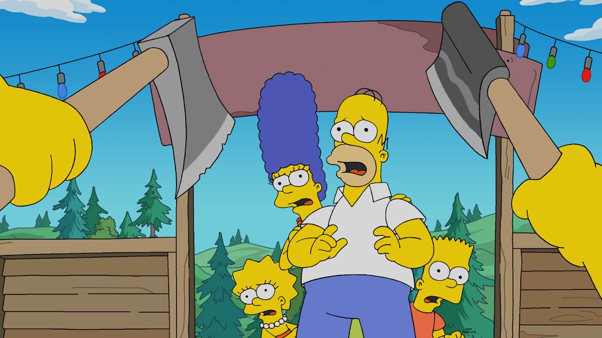 Lisa shows up at the axe-throwing contest and accuses Homer and Bart of trying to help her cheat, but they deny it. Then she reveals that they are in fact cheating at that very contest by using a giant magnet behind the target, and the rest of the competitors become very upset. The Simpsons must flee the competition on ATVs they won underhandedly, with all the other axe-wielding Springfieldians in pursuit. Hiding behind a billboard, Bart and Homer continue to deny they had any involvement in Lisa’s camp application, and Marge is forced to admit that she was the one who faked the photos. Realizing that he corrupted his wife away from being the purely good person she usually is, Homer has a breakdown and throws up in the bushes, with the sound attracting the rioters. Homer begs Cletus (Hank Azaria) to kill him with an axe, but Cletus and the others say they just wanted to rough him up a little and that he’d have to sign a waiver first. But before Homer can follow through on that, goons from the camp throw sacks over the Simpsons heads and bring them to the campus in front of the Dean of Admissions (guest star Ken Marino).