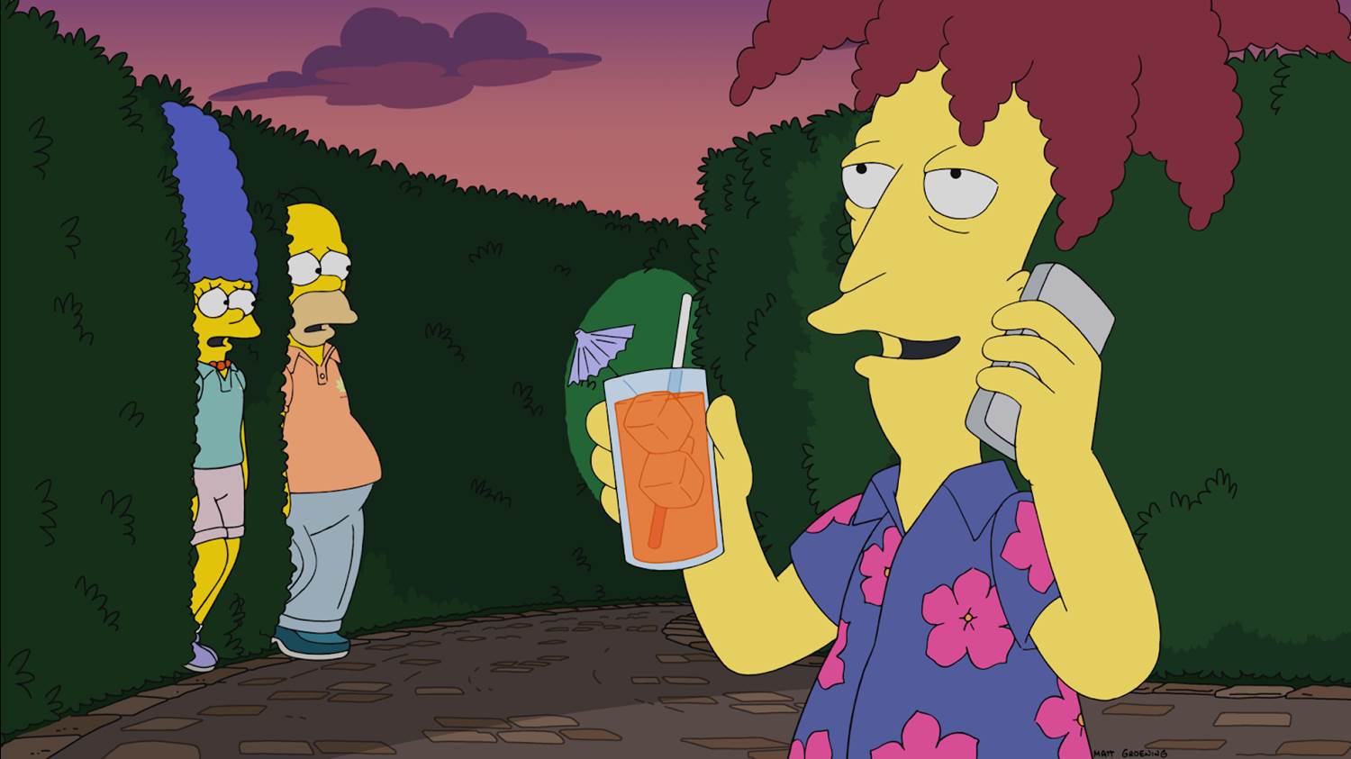 In the present, the Simpson family are pleased to find that they have finally saved up enough points to visit the Yellow Lotus resort, but once they get there they quickly discover (via hotel manager Lindsay Neagle, voiced by Tress MacNeille) that they have only earned 20 minutes at the posh destination. As they are being escorted out, they notice a wealthy woman named Tasha (guest star Chloe Fineman from Saturday Night Live)-- clearly a direct spoof of Jennifer Coolidge’s character from The White Lotus, even I know that– who needs a spare room just for her luggage. Bart has the idea for the Simpsons to squat in Tasha’s luggage room, and the whole family– even Marge– quickly agrees to that pitch because of how much they feel they have been swindled. But upon moving into the room, they overhear Tasha speaking to her husband, who turns out to be the infamous Sideshow Bob (Kelsey Grammer, returning for his 24th appearance as Bart’s long-time nemesis). Naturally the Simpsons are suspicious of Bob’s motives here and confront him about it, but Krusty the Clown’s usually-villainous ex-sidekick promises them he will keep quiet about them staying in the hotel for free if they don’t spill the beans to Tasha about him being an attempted murderer.