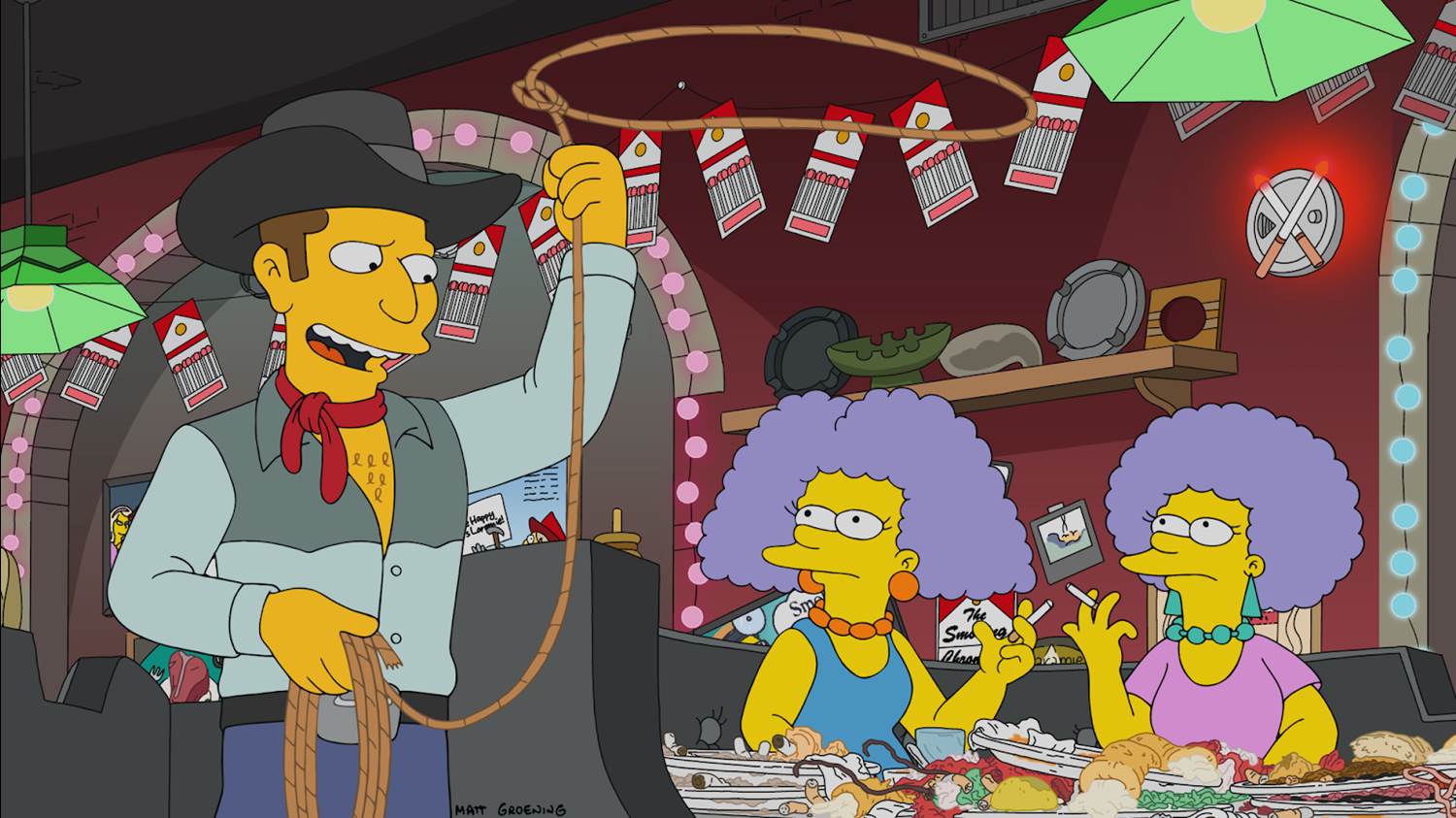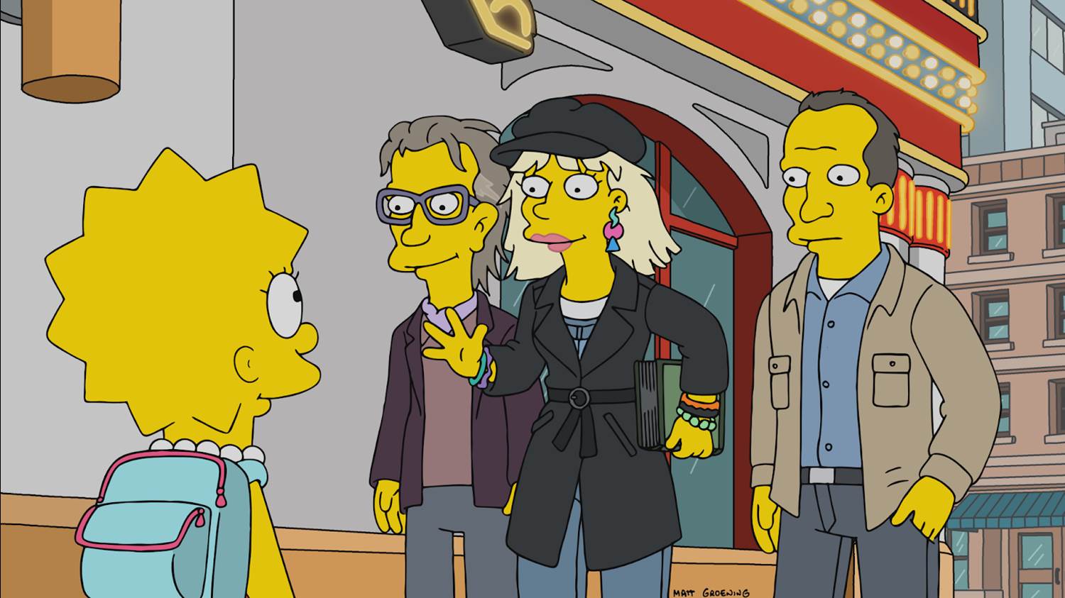 At the beginning of “Desperately Seeking Lisa," the title character (voiced, as always, by Yeardley Smith) and her mother Marge (Julie Kavner) have been uncharacteristically getting on each other’s nerves lately, so Lisa is being sent on an overnight trip to Capital City with her aunts Patty and Selma (both also voiced by Kavner). Naturally Lisa has a long list of cultural sites she wants to visit in the city, but Patty and Selma’s priority is to spend an entire day pigging out at a Laramie Cigarettes theme restaurant (Surgeon General’s Warning: “The food here is delicious!") in the tourist. But after they rather ironically get kicked out of the dining establishment for smoking, Patty and Selma run into some artist friends they had met a year earlier at a Pride parade (guest stars Richard E. Grant from Star Wars: The Rise of Skywalker and Molly Shannon from Only Murders In the Building) while they sneer at out-of-towners.