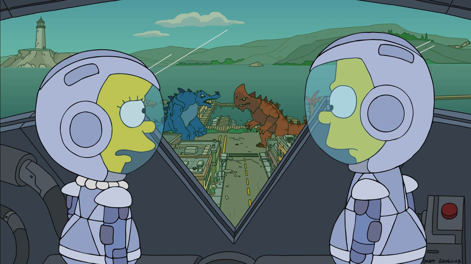 The remainder of this installment sees Lisa and Bart combatting the monsters using the robot’s Noogie Power, Purple Nurples, and skateboarding/bolo tricks utilizing a school bus and a wrecking ball. Seeing their allies defeated, the other four monsters give up and retreat back into the ocean, to the cheers of everyone in Springfield. Over a loudspeaker in the robot, Bart and Lisa give a speech about how the only way to keep the monsters away is to “remember what we all have in common and reject the echo chambers of cable news and social media." Of course then the show cuts to “three news cycles later," when Springfield is just a pile of rubble, with the red and blue monsters having returned to fight each other once again. “Well, I guess civilization had a good run," says Lisa, as she and Bart watch the carnage from the cockpit of the now-destroyed robot.