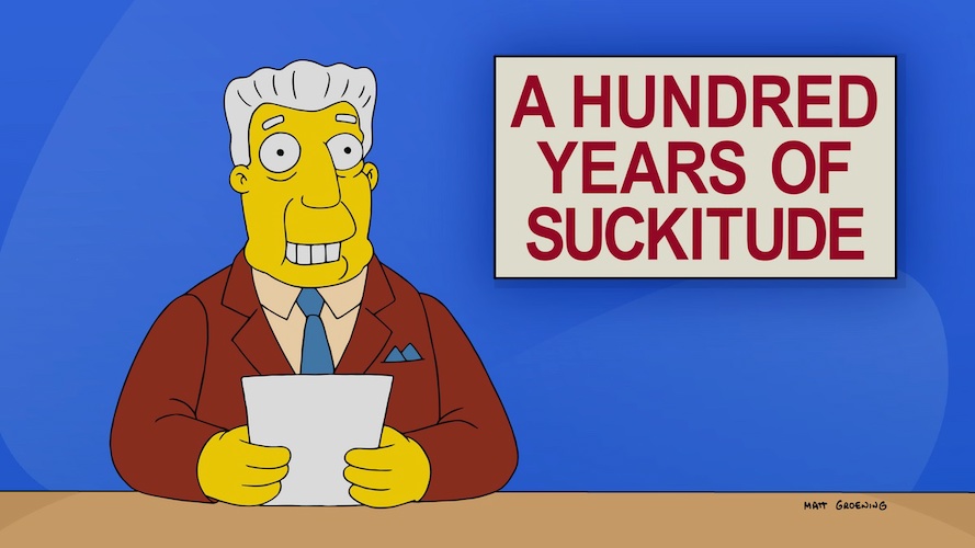 After Faustos seemingly dies on the mountaintop, the bowlers begin to lose their will to go on, all eventually collapsing and being covered in snow until Homer smells Marge’s cooking– from an impressive distance, mind you– hears the voice of his dead mother (returning guest star Glenn Close) warning him about death and where she supposedly ended up in the afterlife, and rallies enough to tie everyone else to himself and march down to the First Church of Springfield, where their collective funeral is being held. These are all funny ideas, but most of the jokes just didn’t land for me this week and I would call the writing of this episode weak overall. There’s a mid-credits sequence that revives Fausto and has Reverend Lovejoy (Shearer) telling him not to “make a meal" out of still being alive, and I was left with not much more than a couple smirks on my face throughout this half hour. It’s unfortunate because “Team Homer" is one of my absolute favorite entries in The Simpsons’ oeuvre, so it would have been nice if another follow-up could have been closer to the quality of some of the other episodes this season. Oh well.