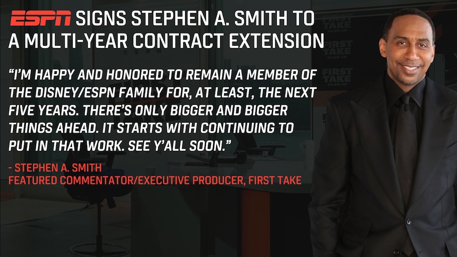 - Stephen A. Smith: “I’m happy and honored to remain a member of the Disney/ESPN family for, at least, the next five years. There’s only bigger and bigger things ahead. It starts with continuing to put in that work. See y’all soon."