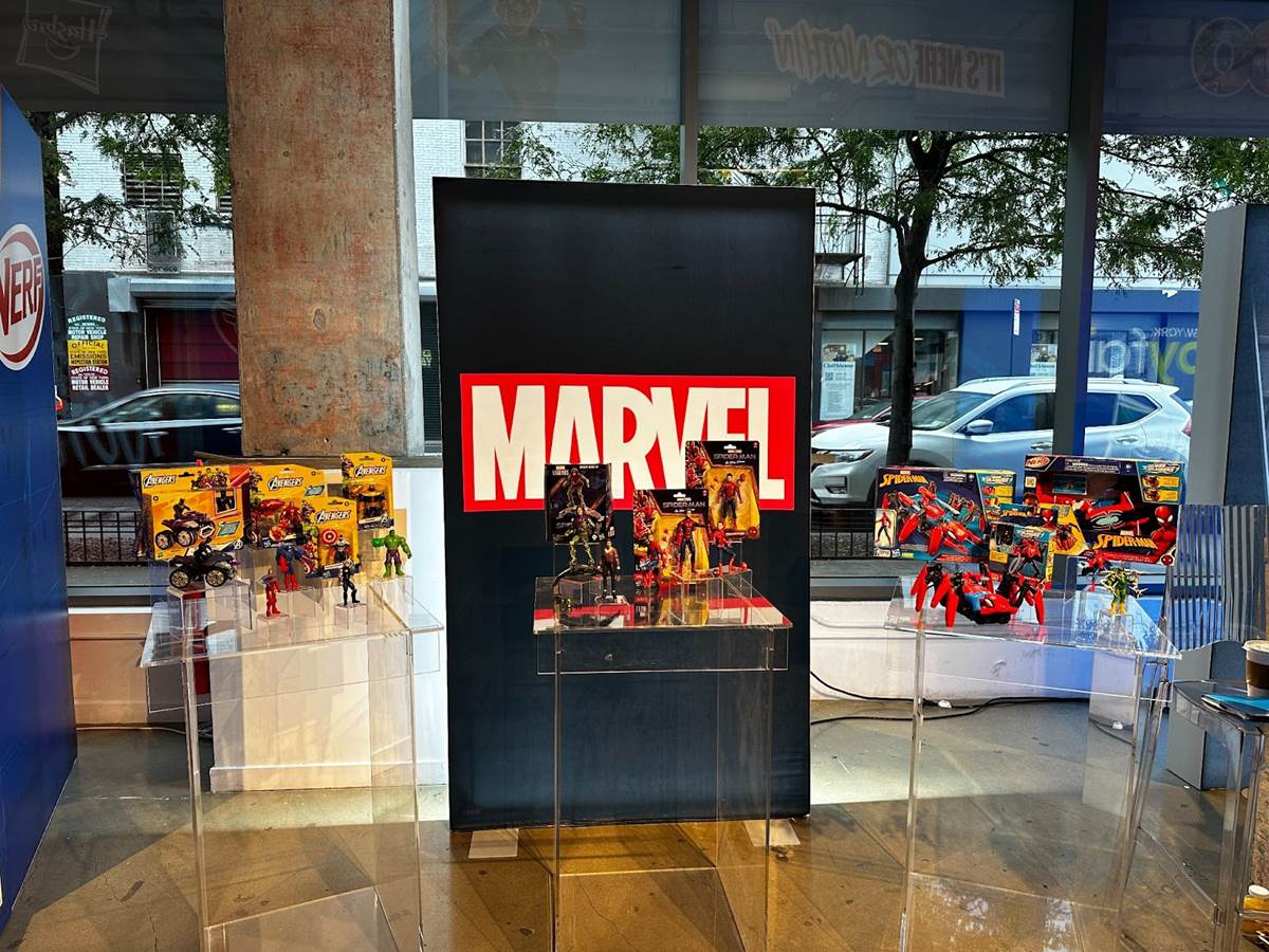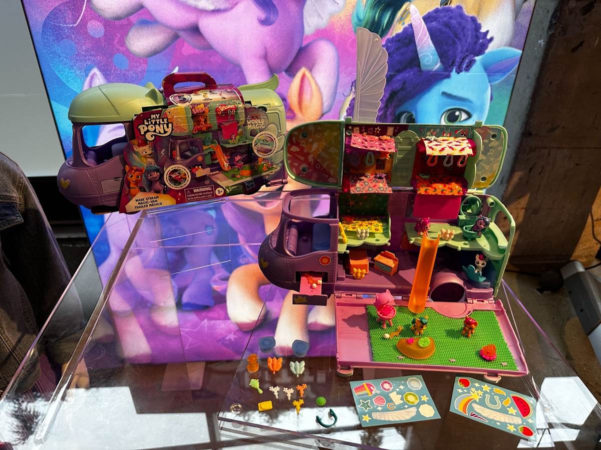 Mr. Potato Head is among Hasbro’s longest-running homegrown brands, although Tonka Trucks predates the plug-in tater (Hasbro acquired the metal construction vehicle line in 1991). Star Wars fans will be familiar with Kenner and one of their biggest products was the Easy-Bake Oven, which debuted in 1963 (Hasbro acquired Kenner in 1993). As a child of the 80s, my attention was focused on toys that also had an animated series, like Transformers, My Little Pony, G.I. Joe, Jem and the Holograms, and Pound Puppies. What’s fun about this wall is that many of these brands are still in production, with brand-new toys from these lines showcased this year.
