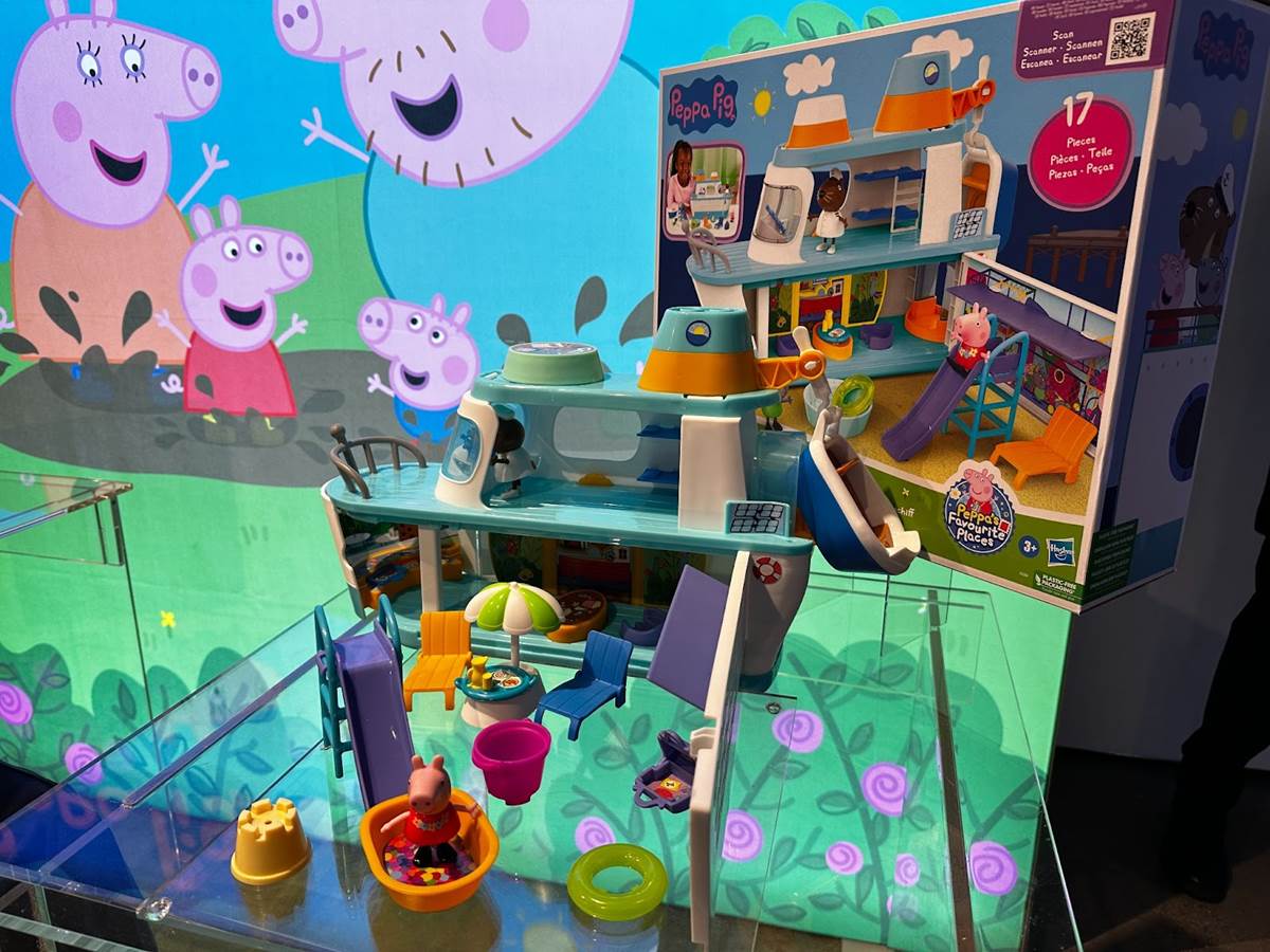 Peppa’s Waterpark Playset (Ages 3 and up, MSRP: $29.99) comes with figures of Peppa and George, who can be changed into their swimsuits. They can ride the slide on a flamingo floatie, which leads into the swimming pool. Comes with 15 pieces.