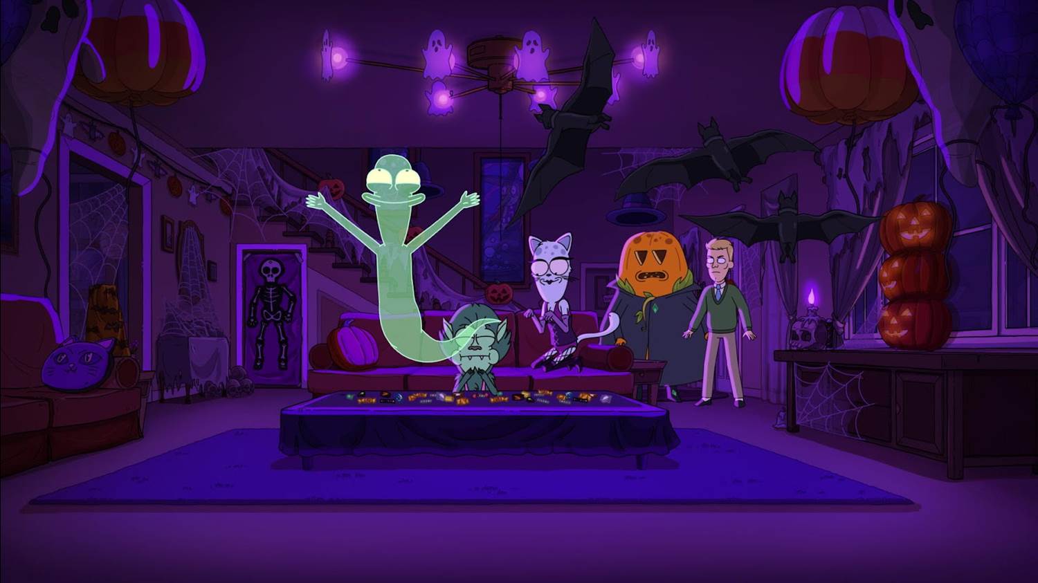 Unfortunately for them, it turns out that Korvo has a curse left over from the previous Halloween special– it seems as though he is rapidly transforming into the next Great Pumpkin after having killed the previous one, The Santa Clause-style. A witch (Ashley Adler from the Disney Dreamlight Valley video game) appears in a cloud of smoke to explain all of this to the family, but Korvo zaps her into a slimy amorphic blob and hands her over to the Pupa (Sagan McMahan) and his robot JK7 to deal with, in an effort to postpone his eerie fate. But as the witch warned him, resisting the transformation only causes the people and environments around him to become even more imbued with Halloween spirit, so Terry turns into a ghost, Yumulack becomes an overly sexy cat, and Jesse morphs into a candy-corn-hungry werewolf. Meanwhile the Pupa and JK7 do their best to eliminate the witch, by smashing her with a rock and running her over with a train, but their struggles are in vain, as this magical being seemingly cannot be destroyed.