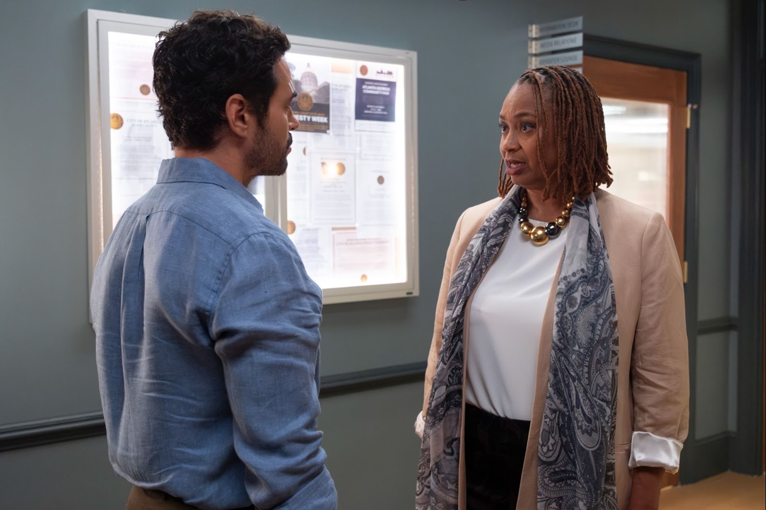 District Attorney Marion Alba (Gina Rodriguez) finishes leading a press conference saying that despite Rafael’s confession, they are still investigating the murder of the two APD officers. When she exits, Mayor Barbara Anthony (Olivia D. Dawson) is furious with her for not corroborating the story. “I want this case closed," the mayor warns Marion. Captain Norton Cromwell (Matthew Sean Blumm) offers to help her with whatever she needs.