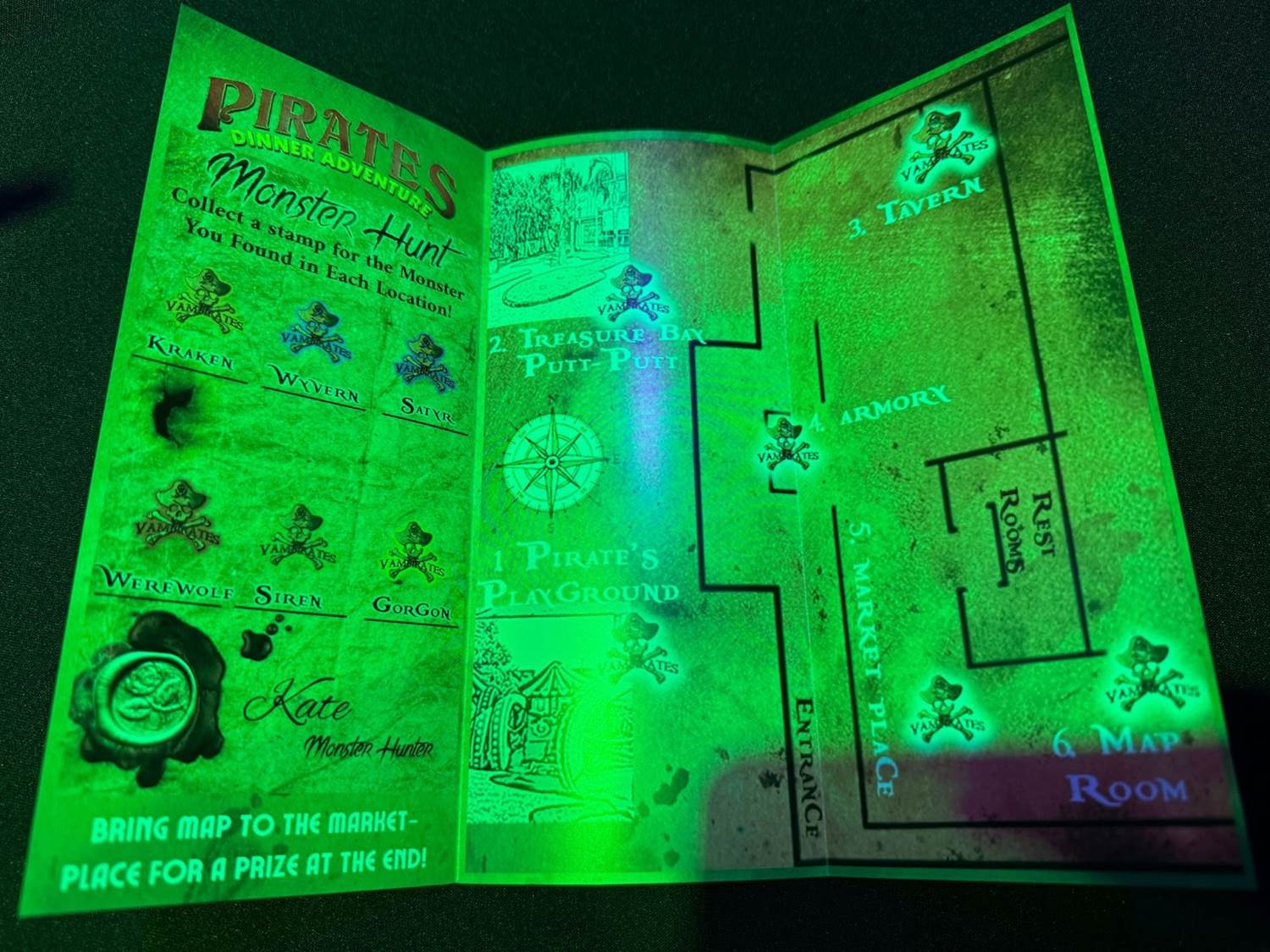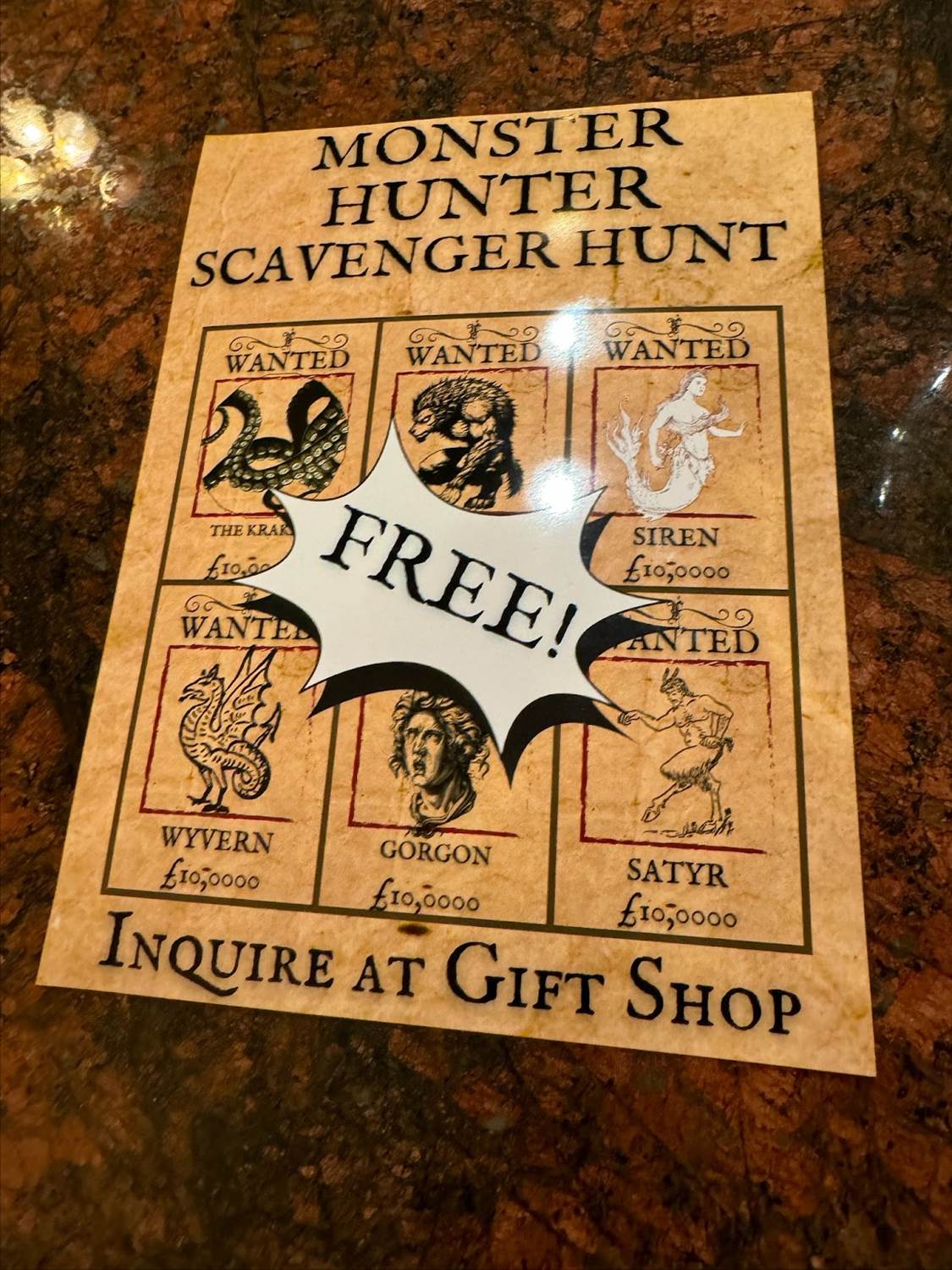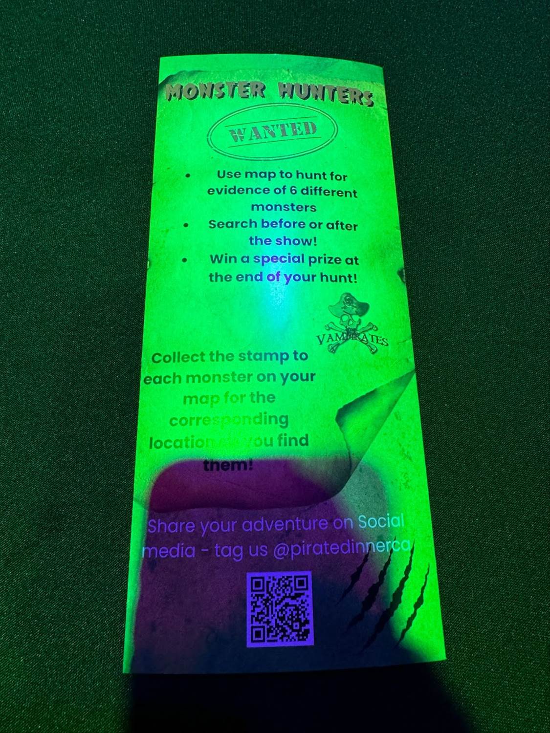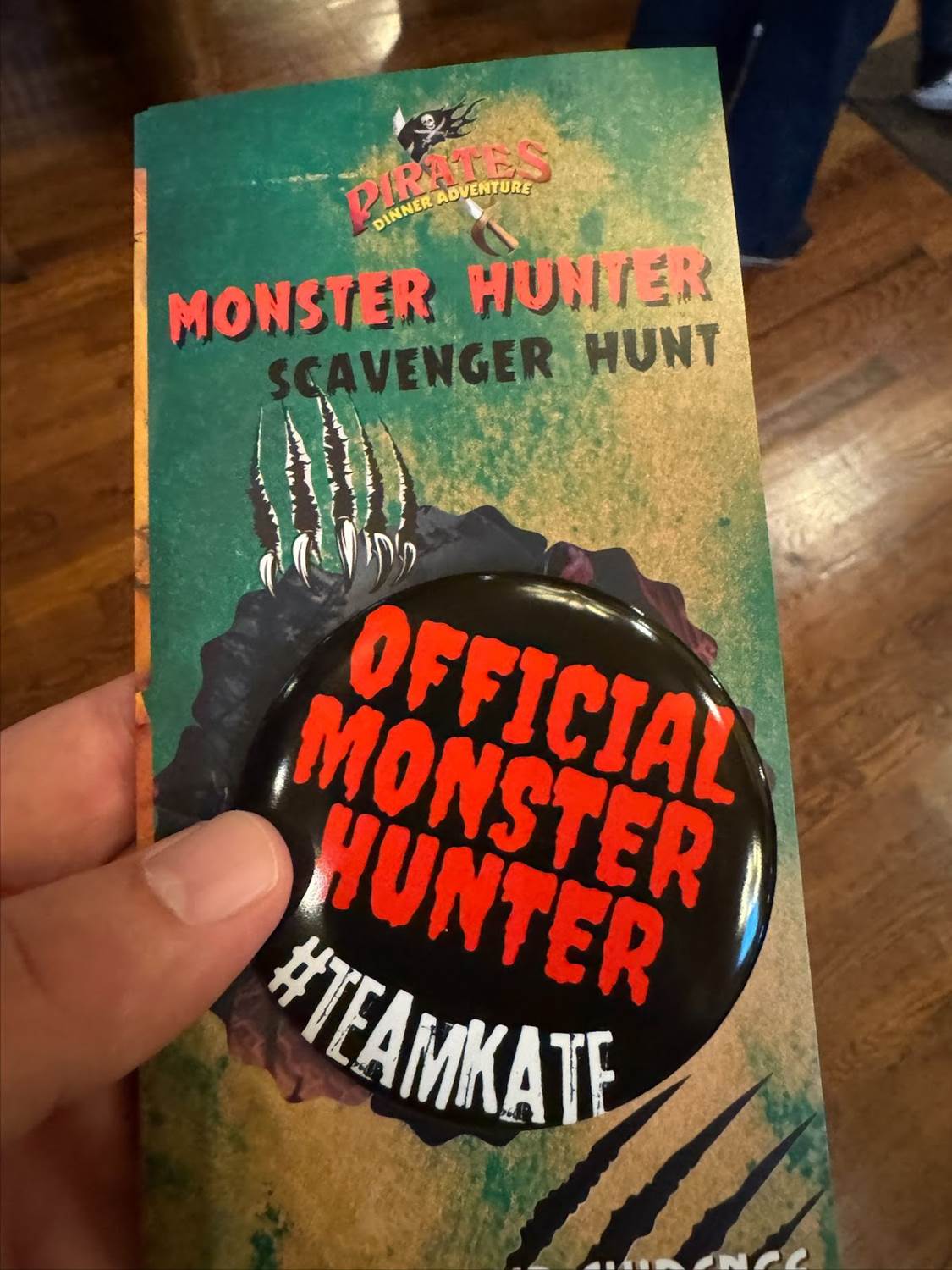 One of the first things we did during this media event was the Monster Hunter scavenger hunt, which sent us looking for an assortment of mythical beasts out in the exterior “Pirate’s Playground" and inside the lobby of Pirate’s Dinner Adventure. Upon completion of the hunt, we were rewarded with a fun button declaring us Official Monster Hunters.