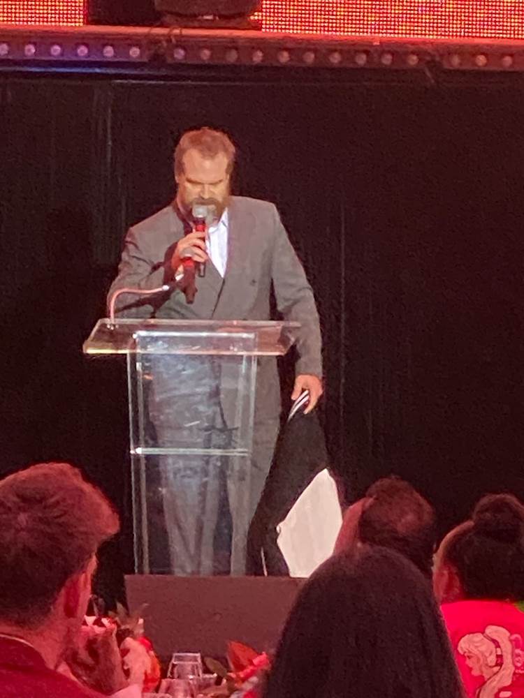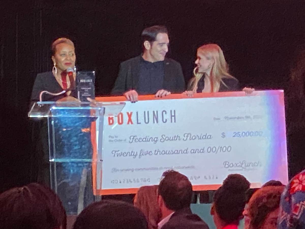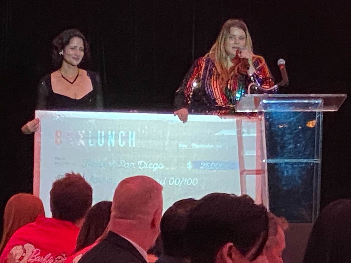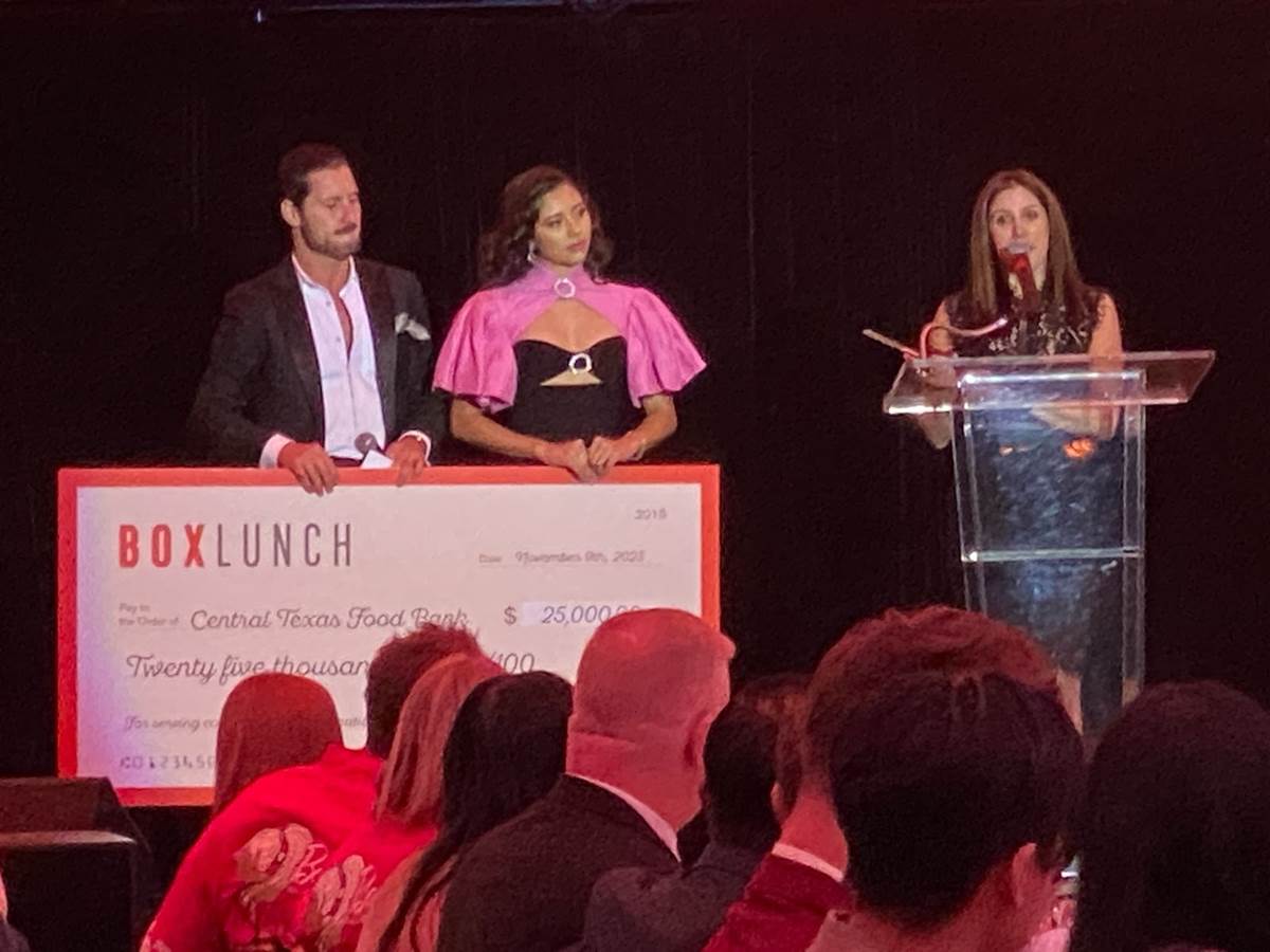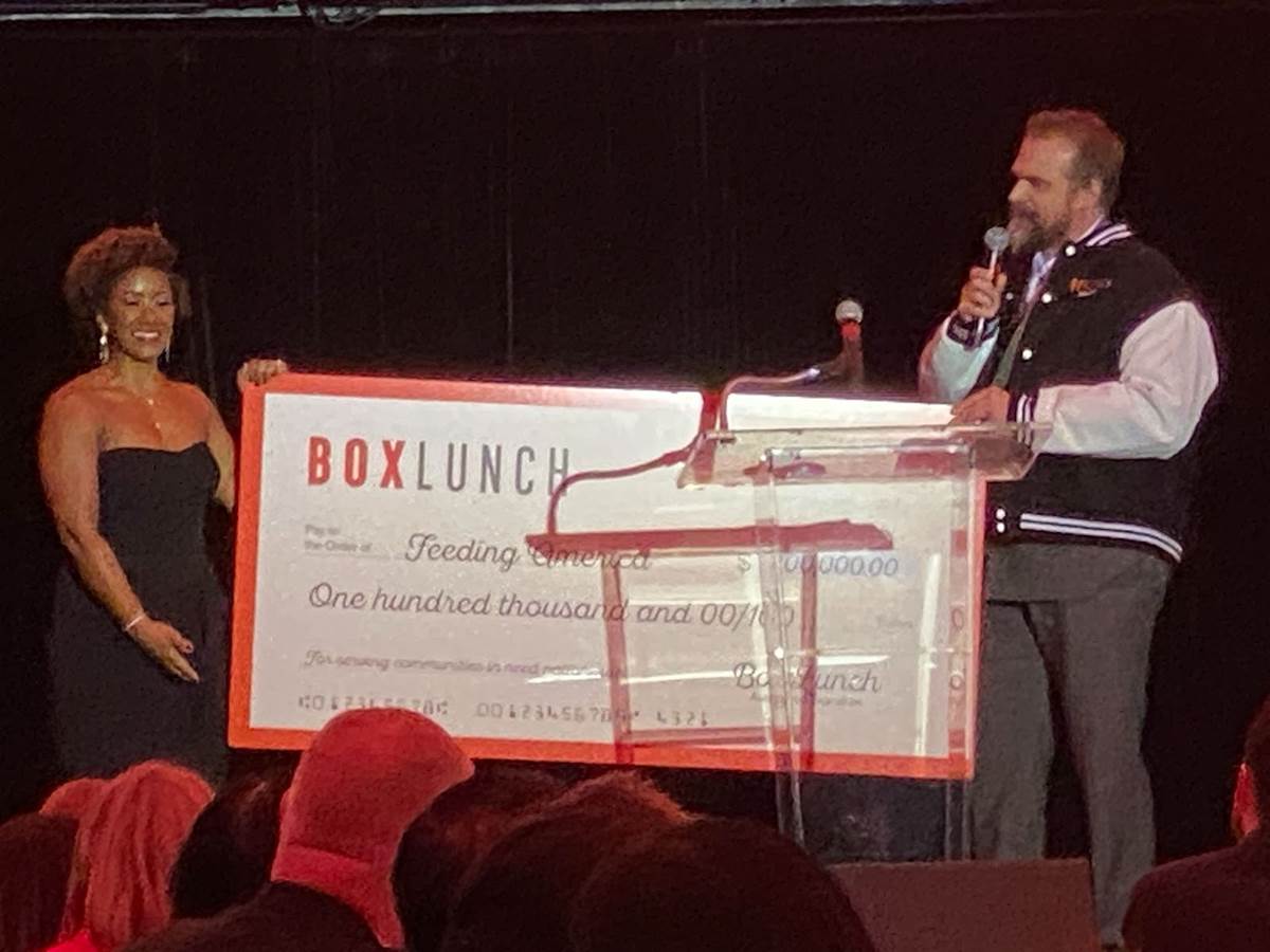 Next it was time for this year’s BoxLunch Giving Ambassador David Harbour to take the stage, presenting two enormous $100,000 checks to Feeding America’s Jennifer Polk.