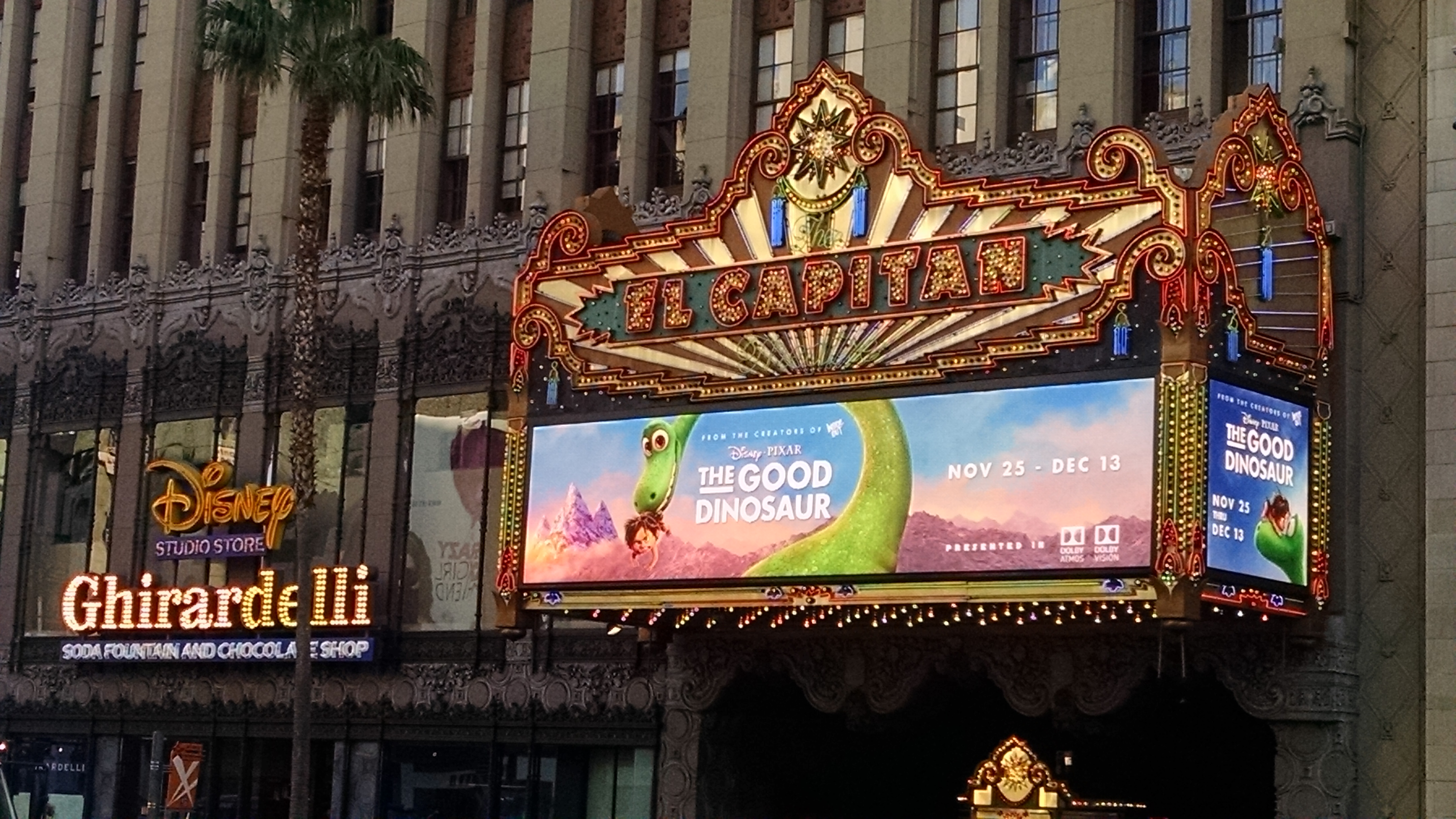 The El Capitan Theatre oftentimes has a special exhibit downstairs that coincides with the movie they’re playing. As someone who has now been to number of these exhibits now, I have to say this is likely the coolest as the Natural History Museum and Raymond M. Alf Museum of Paleontology actually lent out dinosaur fossils to be displayed. Seeing a giant T-Rex skull or a femur of a Apatosaurus (the dinosaur species that The Good Dinosaur’s lead, Arlo, is) was very neat. There’s even a TV with a dinosaur documentary playing as well as a “dinosaur expert” on hand to answer any questions. It makes the usual high price of El Capitan’s tickets especially worth it. If you end up loving the movie, you can always drop by next door at the Disney Studio Story & Ghiradelli to buy all the newest The Good Dinosaur merchandise.