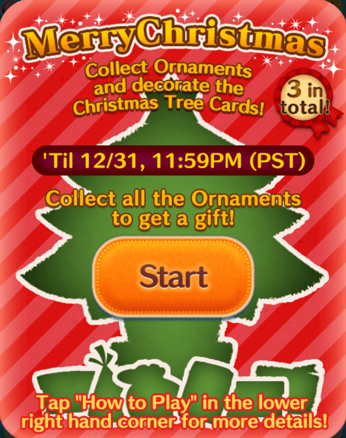 After filling the tree by collecting all 10 ornaments, you are presented with three presents to choose from. I was hoping I would get a Holiday Tsum Tsum in the gift, but instead i just got some coins, gems and hearts. Allegedly one of the other boxes contains skill ticket and Premium box tickets and the third holds Holiday Donald and Daisy. My fingers are crossed that there are just two boxes under Tree 2 and then just one for Tree 3 so that every player can be sure to get them. If not, I'm going to go "Bah Humbug" all over the place!