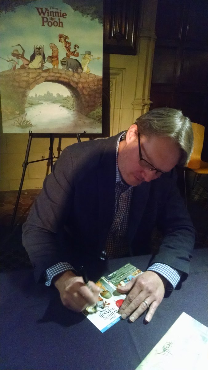 After doing some fun voices for a while, Jim Cummings then wanted to tell another story about Burny Mattinson, how his wife, Sylvia, made a stuff Pooh bear decades ago with the hopes of getting it used in the live-action credits segment of The Many Adventures of Winnie The Pooh. Walt disappointly said, "Oh, I'm sorry, but the live-action scenes have already been filmed already!" Well, a rough four decades later, that very same bear got to be used in the live-action credits scenes at the beginning of this movie! Easily one of the sweetest behind-the-scenes stories.