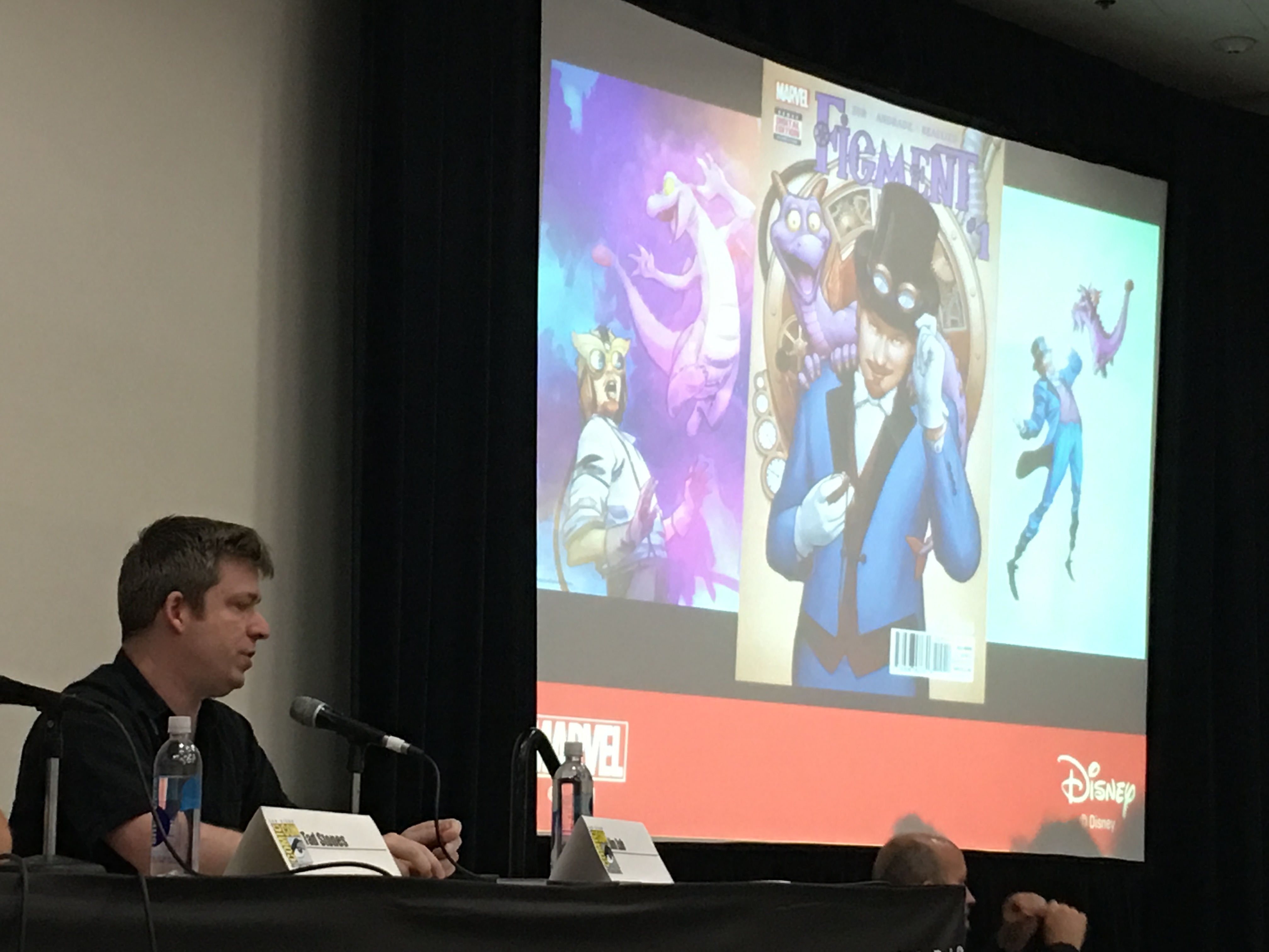 Due to another panel Zub had to get to, he gave us a quick backstory on Figment and shared a fun story of his recent visit to Epcot where he sparked an impromptu signing of his books in the gift shop after noticing a woman buying all the different issues of Figment and Figment 2. But before he headed out the door, he shared that, just prior to panel, he had received word that he could announce another Figment series was on its way! While we were on the subject of Figment, Stones shared some of his history with helping create the attraction and his love of the little dragon.