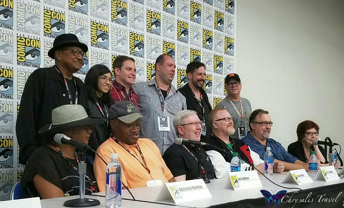 The panel member list read like a list of “Who’s Who” in entertainment.Front Row: Adrienne Norman, Leo Sullivan, Leonard Maltin, Gary Trousdale, Don Hahn, Jane Baer
