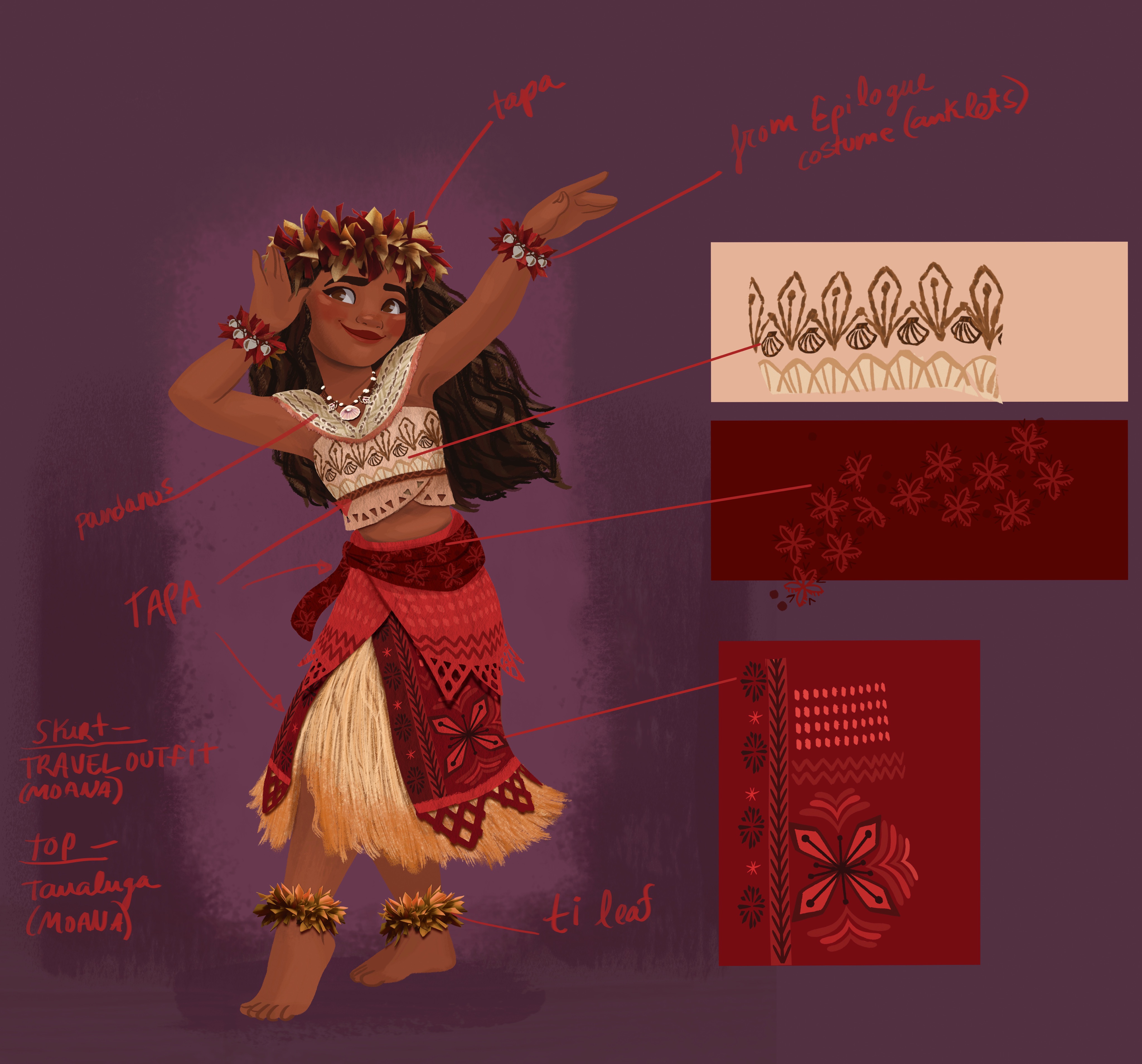 From a character design standpoint, we can also examine the look of the title character. During research trips, the artists paid close attention to physical characteristics that Pacific Islanders find beautiful and incorporated those into Moana. Costume designer Neysa Bové studied clothing material available on the islands to determine Mona’s wardrobe, including the materials, patterns and colors that would have been available. When she dons her royal costume, her headdress is covered in red parrot feathers, which were a form of currency thousands of years ago. Red was also the color of royalty in the Pacific Islands, which is why she is always in various shades of red.