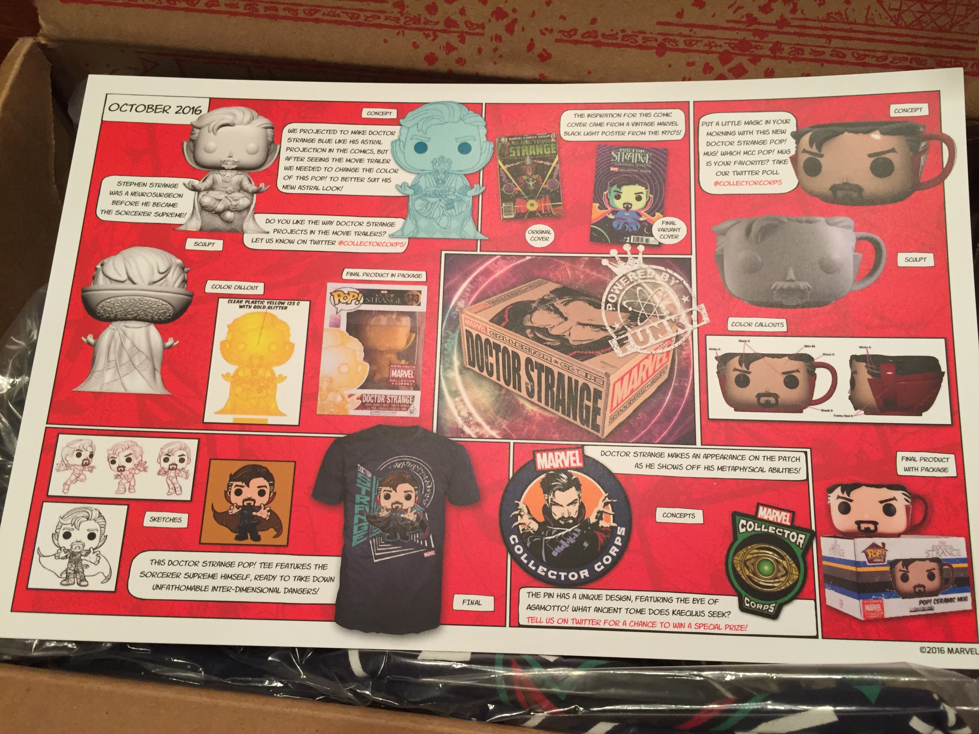 Marvel Collector Corps, the bi-monthly subscription box service from Funko Pop, shipped its tenth box in October themed to the incredible upcoming Marvel Studios film, Doctor Strange. Each box is custom designed to fit the theme of its contents, with the doctor's piercing gaze drawing you in. Everything included in the Collector Corps is exclusive to the subscription service.