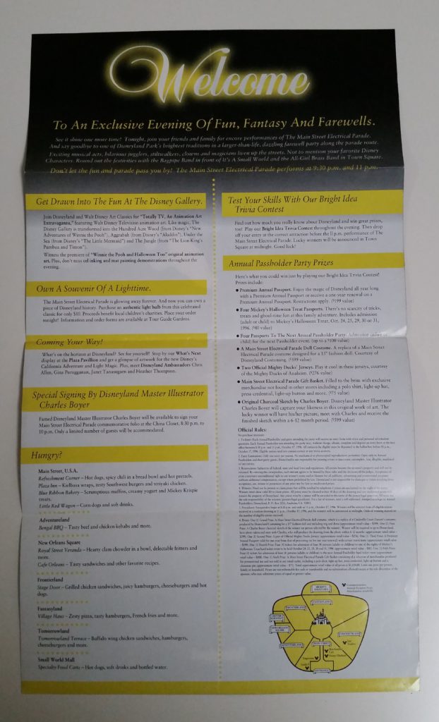 As the parade was originally scheduled to end on October 15, 1996, an Annual Passholder "encore performance" was scheduled for October 17th.