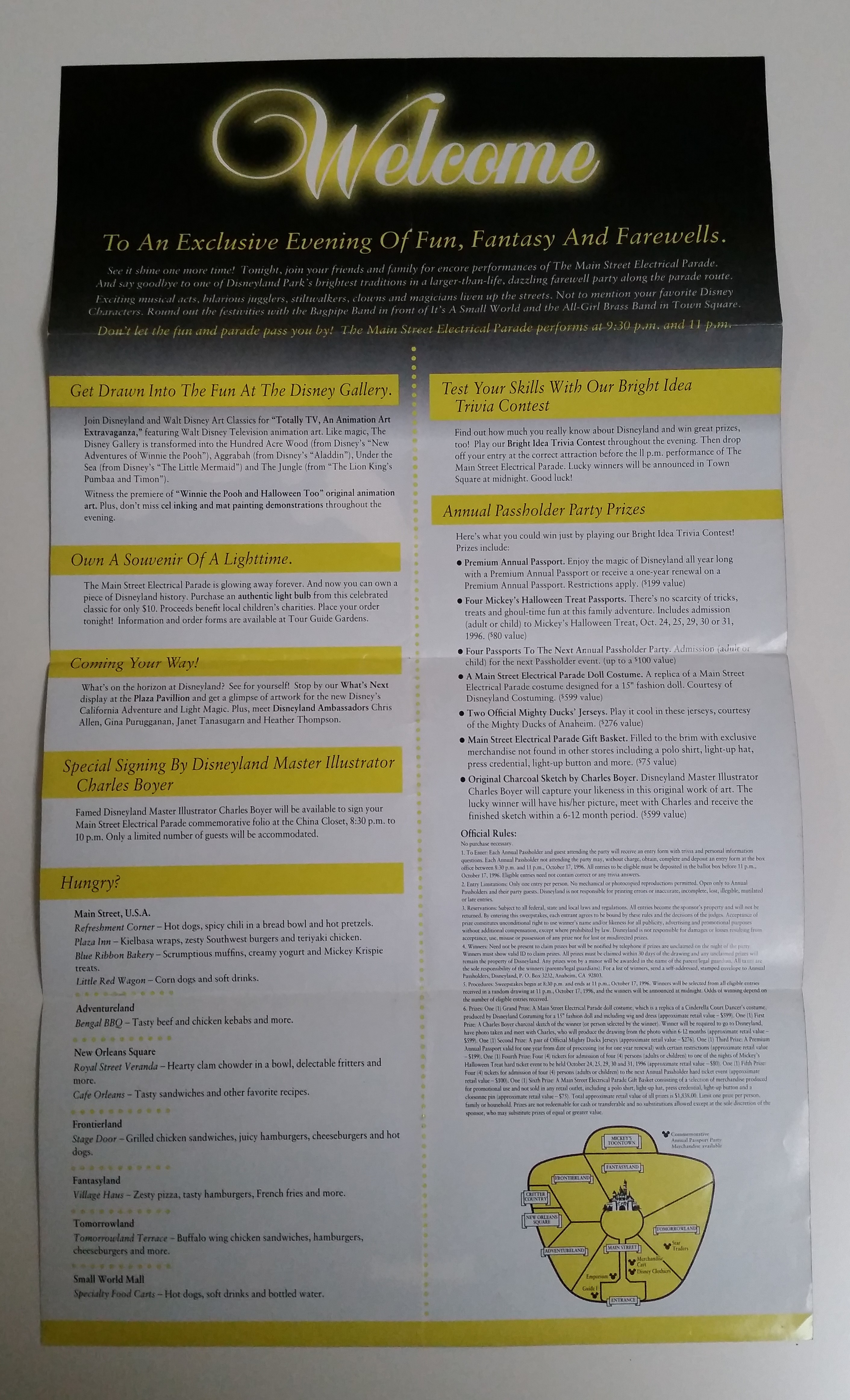 As the parade was originally scheduled to end on October 15, 1996, an Annual Passholder "encore performance" was scheduled for October 17th.