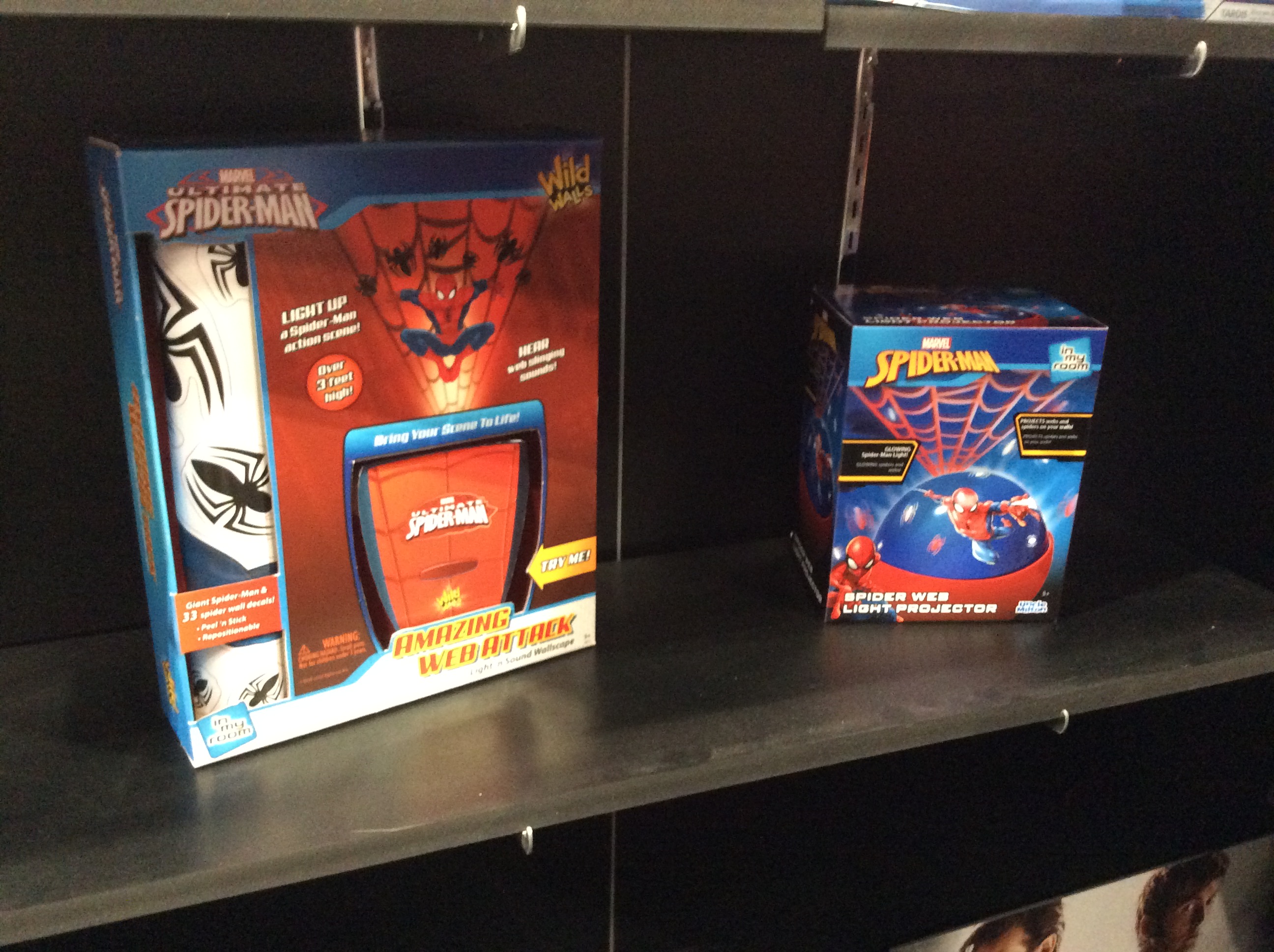 Spider-Man is also featured on some of Uncle Milton's wall lights. The "In My Room" series features a projection ball of Spider-Man images and the Wild Walls light allows kids to decorate their walls with spider stickers and then project Spidey onto their wall along with sounds from the animated series.