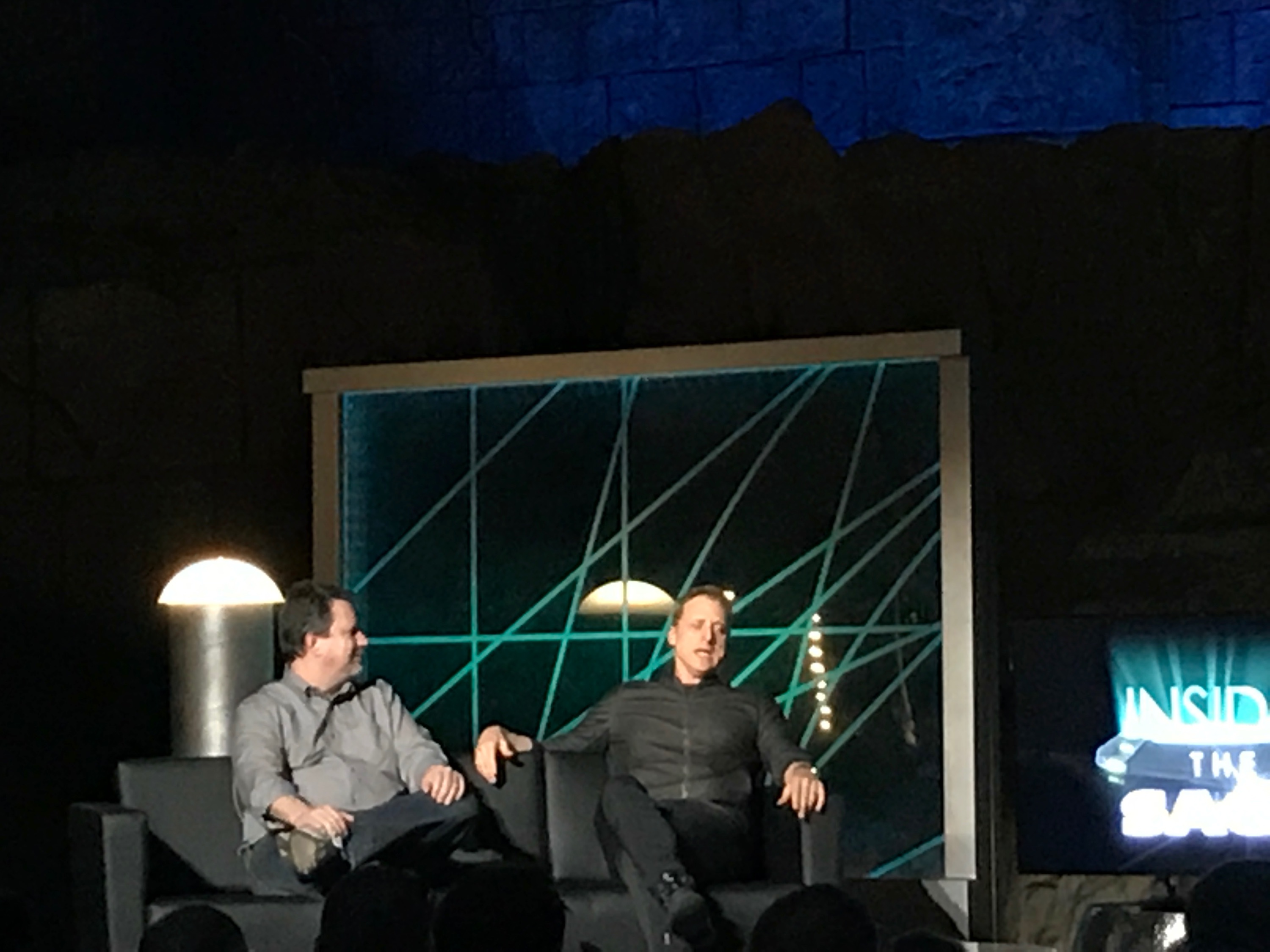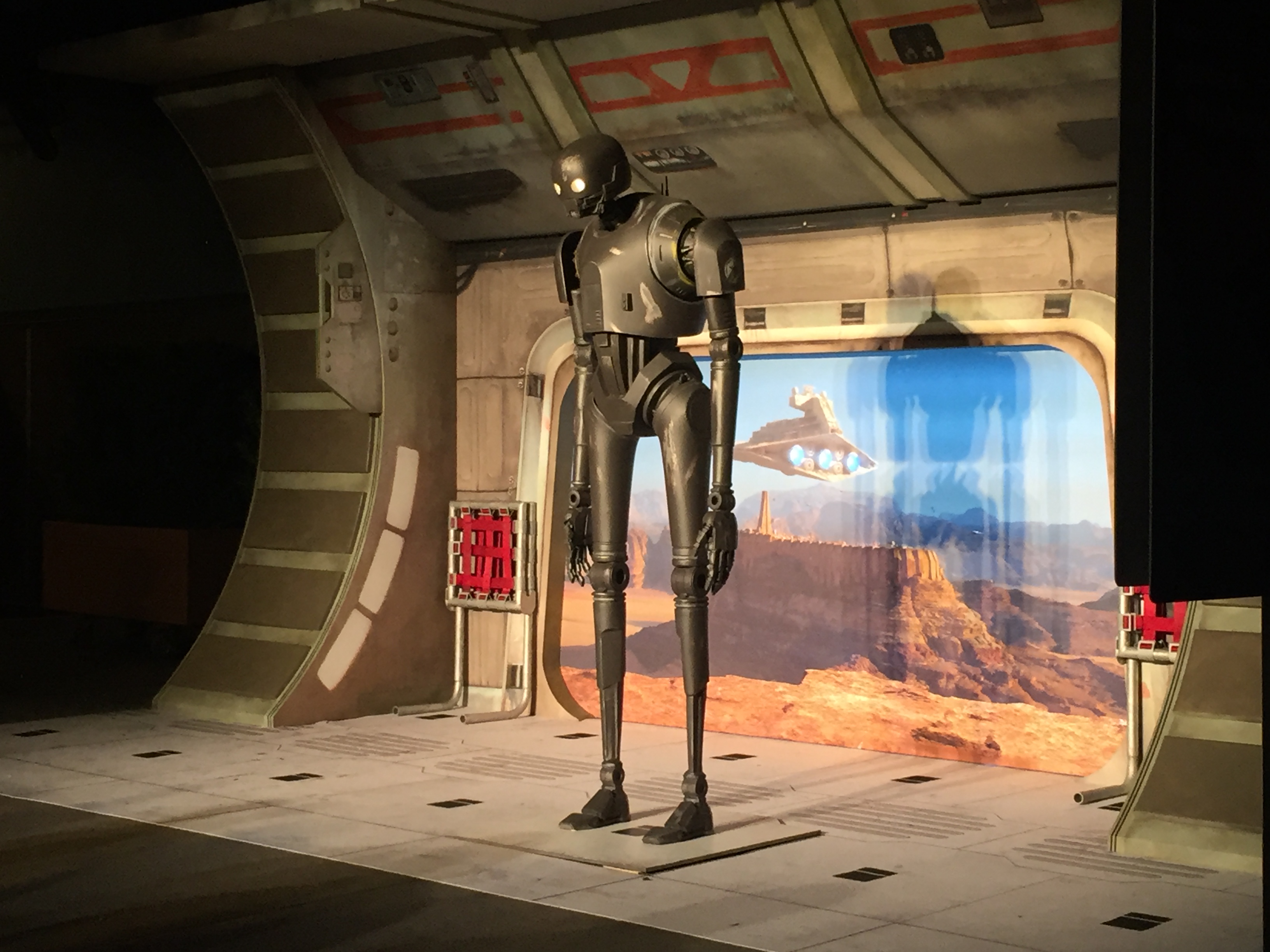 One of the biggest draws of the event was "Inside the Saga: Celebrity Chat Show." On this evening, the focus was on Rogue One: A Star Wars Story and the host was Vanessa Marshall, voice of Hera Syndulla on Disney XD's Star Wars Rebels. Her guests were ILM effects wizard John Knoll and the comedic actor behind K-2SO, Alan Tudyk. She lead an engaging discussion and even asked Tudyk to perform some of his Disney animation voices. The presentation was held on an elevated stage at the Epic Stunt Theater where Indiana Jones is held during the day and there were plenty of seats. There was also an interactive preshow where Andi Gutierrez and Anthony Carboni from The Star Wars Show found guests who could do impersonations of Star Wars characters.