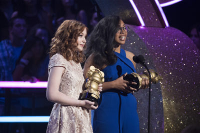 I was beginning to wonder how they were going to present seventeen awards given that we'd already been in our seats for over two hours and things seemed to be winding down. That's when they marathoned most of them via a quick video reel. For a full list of awards, check out our related post. The next honorees won the Heroes for Change award. Jocelyn Woods is helping teens get college funding and Natalie Hampton created an anti-bullying app that helps kids find friends to eat lunch with at school. In addition to taking home Ardies for their efforts, the girls also got to introduce Grace Vanderwaal's performance.