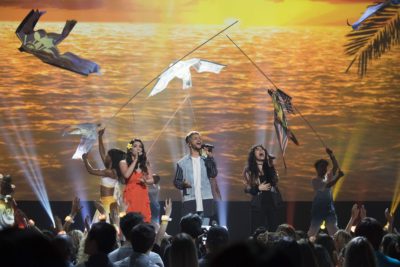 How do you follow something like a tribute to Britney Spears? If you're Radio Disney, you bring Train to the stage to perform their feel good song of the year, "Play That Song." While kids watching at home might not understand, most of the audience at the Microsoft Theater was comprised of adults, who all clapped and swayed along to the band's lead single off their tenth studio album. Train has been around since 1993, the same year Britney started on the MMC. Coincidence?