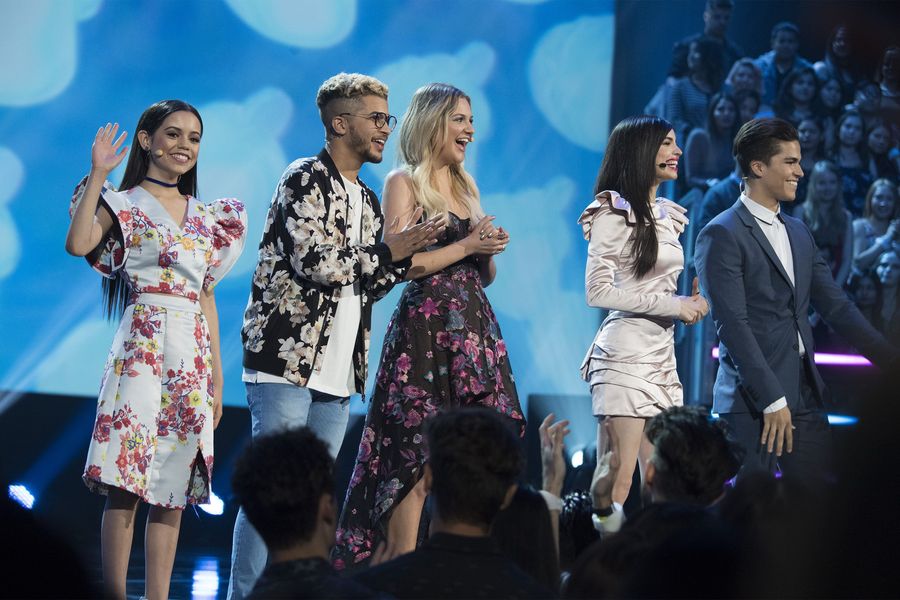 This show used five hosts and one of the few times they all appeared on stage together was to introduce the Ardie's High Five, created by Barry White Jr., a teacher from North Carolina who created individual high fives for all of his students. He made his way down the line, doing his high five dance with Jenna Ortega, Jordan Fisher, Kelsea Ballerini, Sofia Casrson, and Alex Aiono. The first award of the night was for Best Collaboration, presented by Bea Miller to Camilla Cabello for "Bad Things" with MGK.