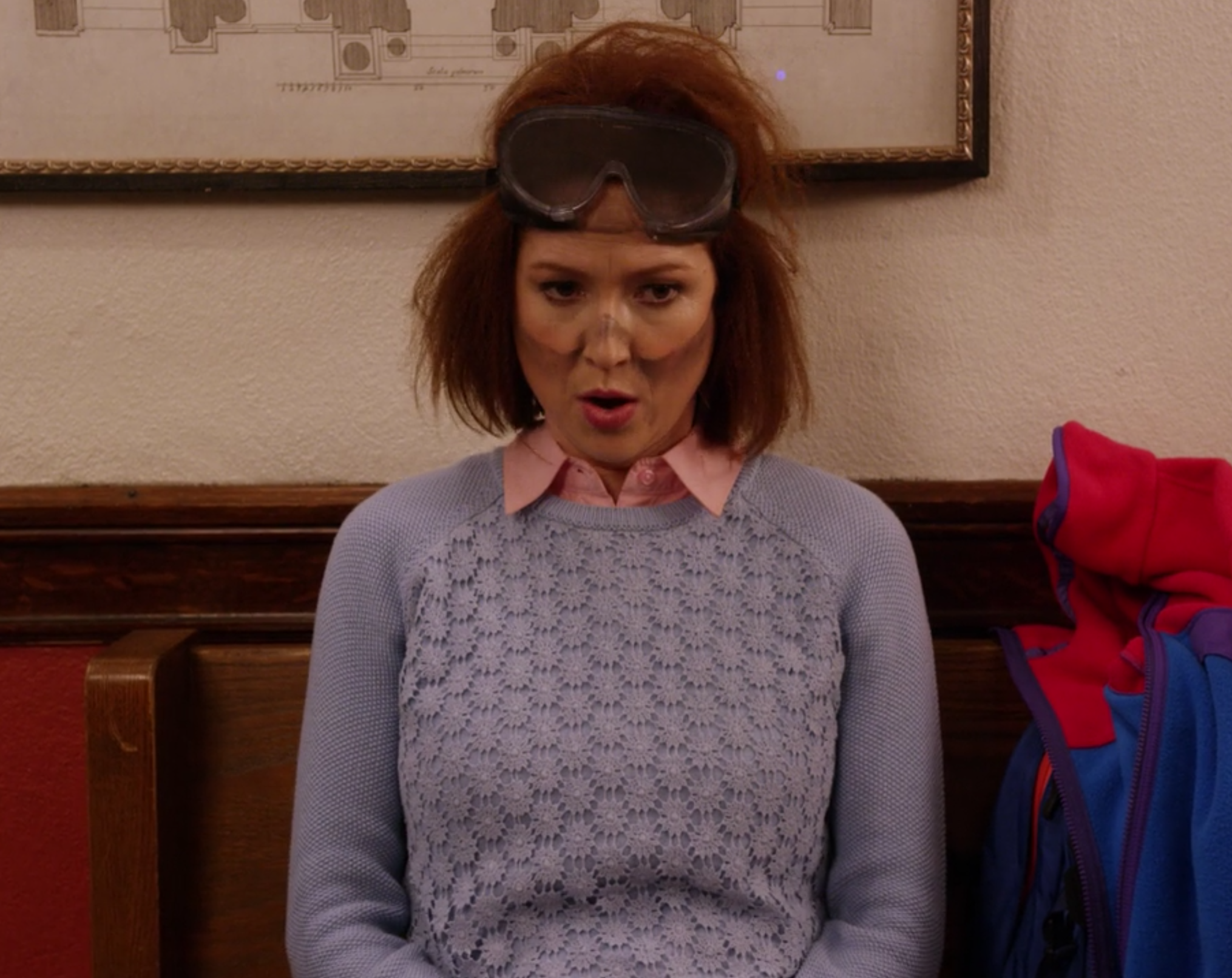 It's time for finals and Kimmy's grades have slipped so far that if she doesn't score a 100% on her chemistry final, she will be expelled. The camera cuts to her with goggles on her head, char marks around her face waiting to meet with Dean Koontz. She tries to cheer herself up: "Okay, this kind of stuff happens to Beaker all the time and he's a professional scientist."