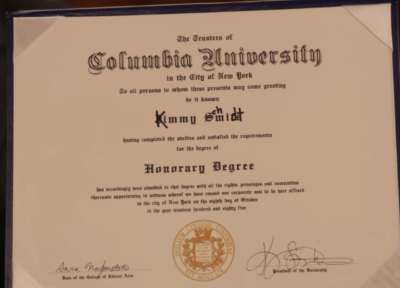 Unfortunately for Kimmy, she fails the test and is forced to leave the Ivy League school. But before releasing her, the Dean hands her a framed diploma with some handwriting correcting some of the letters. "Columbia would like to present you with this honorary degree," Dean Koontz says. "We ended up not giving this to Jimmy Smits because Attack of the Clones was such a turd." Smits, however, must be laughing all the way to the bank. He recently reprised his role as Bale Organa in Rogue One: A Star Wars Story.