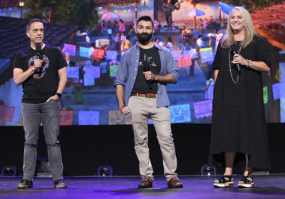 To close out the presentation, Lasseter introduced Coco with Directors Lee Unkrich and Adrian Molina as well as Producer Darla K. Anderson. They revealed more of the plot, which involves a young boy named Miguel who loves playing guitar and idolizes a deceased performer named Ernesto de la Cruz, who is voiced by Benjamin Bratt. When his family takes away his guitar and forbids him to play music, he decides to steal the guitar in Ernesto's mausoleum in order to perform in a Dia de los Muertos contest. But upon taking the item from the deceased, he finds that he can now see the dead and the living can no longer see him. What's worse, is the longer he spends on the other side, the more his body becomes a skeleton. If he doesn't break the curse soon, he could be stuck there forever!
