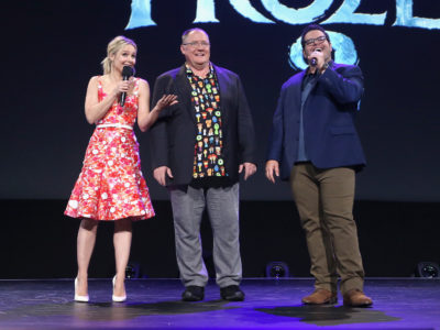 If you thought the room was loud during the clip, it erupted afterwards when the Directors explained that all of the Princesses were voiced by their original actresses (asterisk on "All," as they are only referring to the characters created since 1989). Jodi Benson (Ariel) was welcomed to the stage and each Voice Actress introduced the next in chronological order: Jodi Benson (Belle), Linda Larkin (Jasmine), Irene Bedard (Pocahontas), Ming-Na Wen (Mulan), Anika Noni Rose (Tiana), Mandy Moore (Rapunzel), Kelly MacDonald (Merida), Kristen Bell (Anna), and Auli'i Cravalho (Moana). The fans went nuts and gave them all a standing ovation.