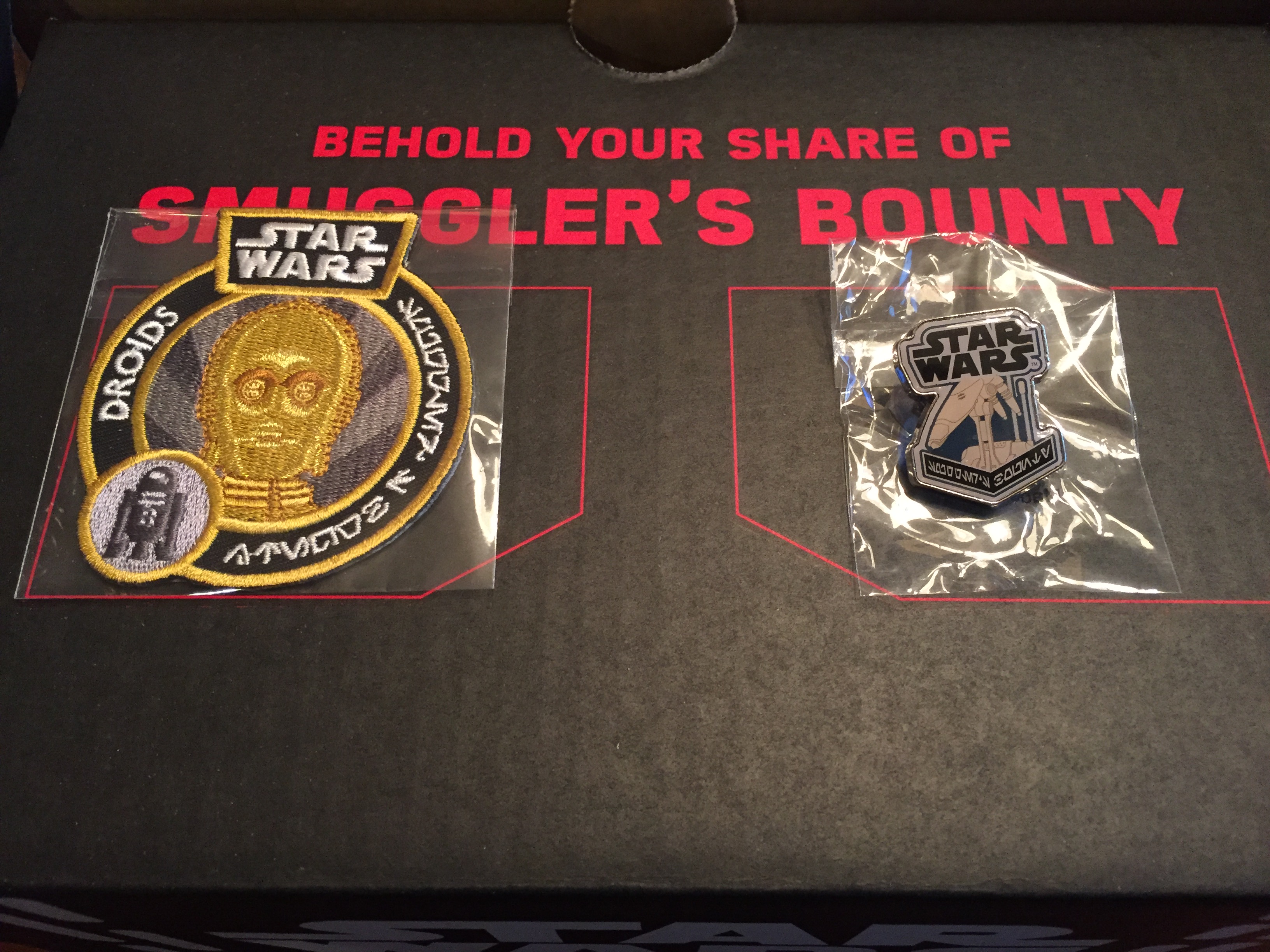 Like past crates, opening the first flap reveals the patch and pin. C-3PO adorns the patch and bears the title of this crate. A R0-GR from The Phantom Menace has a starring role on the pin. Roger, Roger.