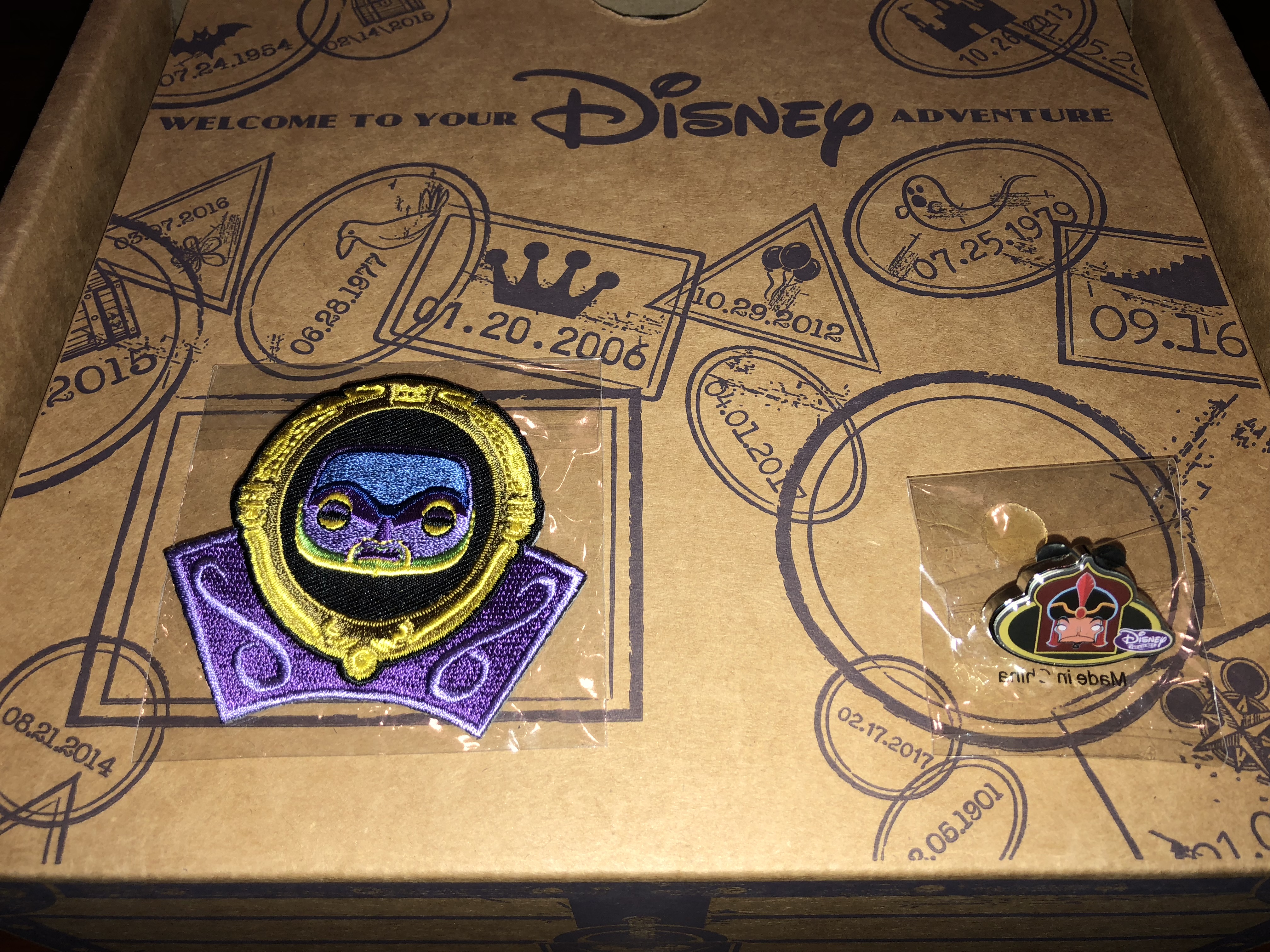 Lifting the fist flap of the box, we find this month's extra spooky pin and patch. It appears that you are, in fact, the fairest in the land with this Slave in the Magic Mirror patch from Snow White and the Seven Dwarfs. You'll also discover just how sssssssssssnake-like you can be with this Evil Sorcerer Jafar pin from Aladdin. Don these items appropriately as you do your routine October bidding.