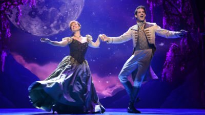 Young Anna and Elsa stay on stage all the way through the end of "Do You Want to Build a Snowman?," meaning the adult actresses (Caissie Levy as Elsa and Patti Murin as Anna) don't appear until "For the First Time in Forever." The sets for the palace of Arendelle are impressive, with sliding windows and doors being rearranged to create different rooms. There are also changeable legs masking the wings, some designed to look like part of the castle, others that allow projections to create winter landscapes or parts of Elsa's ice palace.