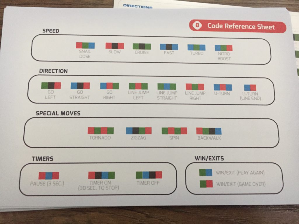 With the starter cards, some of them are complete so you can quickly send your Ozobot Bit through some obstacles, others require you to either color in the blank spaces or use the provided stickers. Ozobot is programed to follow any color line and will automatically stop at the end. However, there are color sequences and when placed on the path in rapid succession, they will cause Ozobot to perform a specific task, such as turning around, going off the grid in a specific direction, or doing something fun, like the "Tornado." Kids can use any markers, but the instructions suggest thicker lines so be sure to look for markers with wide tips if using more colors. The light inside Ozobot can even change to match the color it is driving over.