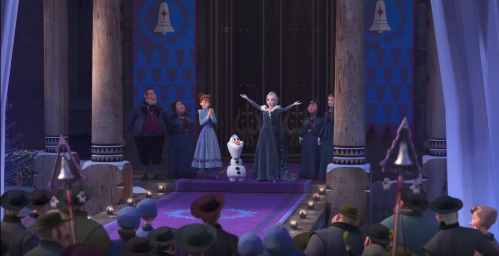 Looking ahead, Mike Giaimo continues to work on Frozen projects with Olaf’s Frozen Adventure releasing this Thanksgiving and Frozen 2 in active production. For the new holiday special, Giaimo designed two new costumes for Anna and Elsa in addition to creating the decorations that allow Arendelle to celebrate Christmas. You won’t find red and green design elements, but instead are treated to dusty blues and grays. Elsa’s cape features her ice tree design, which becomes a touching part of the special. Anna’s costume contains elements of the berry wreaths that decorate the kingdom and also features bells and goats, both of which are a big part of the holiday season in Norway. The short also gave the team the opportunity to work with romantic snow, because the snow in the feature film was always made to feel threatening or isolating.
