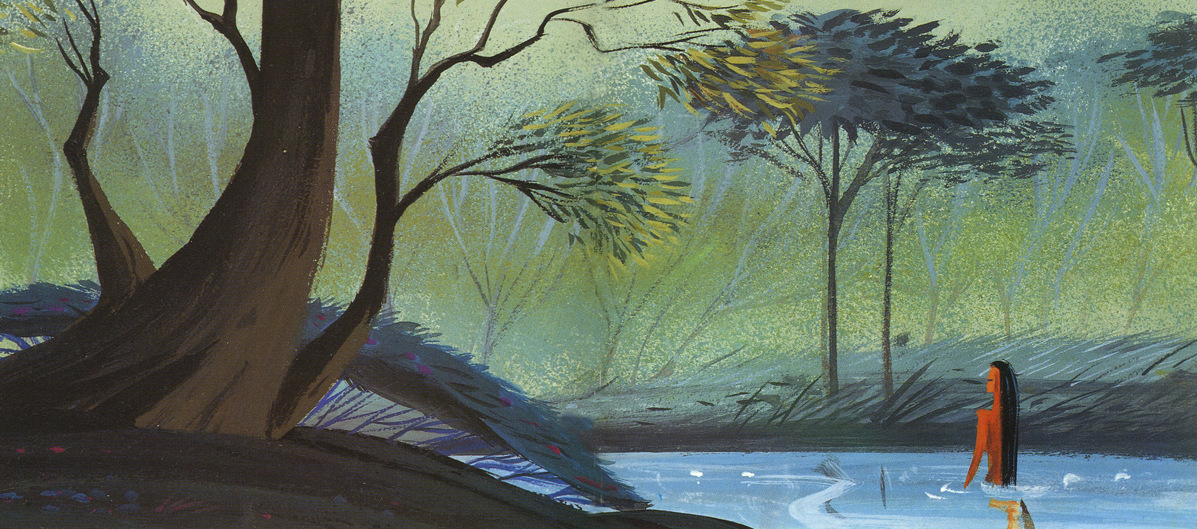 When Mike Giaimo was invited to be the Art Director on Pocahontas in 1992, he wanted the film to stand apart from The Lion King, which was in production and drawing from more naturalistic environments. Since the story was taking so many artistic liberties with history, he wanted the art direction to also take liberties with nature, what he called “A decorative world as a counterpoint to the realism of the story.”