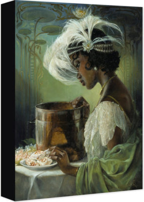 Theurer's collection continues with "Dig a Little Deeper," which finds Tiana looking pensive next to her father's gumbo pot with a plate of "man catchin'" beignets next to it. By her attire and the lily pad wallpaper, I would assume that she has already achieved her restaurant dreams and is now thinking back on all it took to get there. The dream that started with her father, a dream she worked so hard to save money for, and one that grew and evolved during her adventure with Naveen, who turned out to be her true love and made her a real American princess. "Dig a Little Deeper" by Heather Theurer is available on canvas for $149.95.