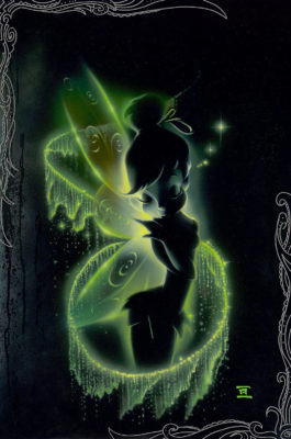 Quite a different take on Tinker Bell is "Faith, Trust, and Pixie Dust" by Noah. His signature style of using primarily black with pops of neon color is utilized most effectively here, where a trail of pixie dust and Tink's radiant wings are the only source of light. She's quite playful here and upon first glance, it's not quite clear what she's doing. Is she flirtatiously blowing a kiss, or brushing her shoulder off like she just did something extraordinary? The answer is left to your own imagination, which is part of the intrigue behind it. Think of it as the "Mona Lisa" of this collection of artwork. "Faith, Trust, and Pixie Dust" by Noah is available in a number of framed options, ranging between $295 and $650.