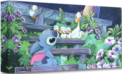 In Lilo & Stitch, Stitch finds deep meaning in the story of "The Ugly Duckling" and feels like a lost swan himself. In this piece by Michelle St. Laurent, viewers can feel Stitch's loneliness and curiosity as he watches a happy family of ducks coming down the steps, one of them trailing behind. In terms of style, this is a bit of a mashup as the ducklings in Lilo & Stitch are modeled after the Silly Symphony adaptation of the Hans Christian Anderson classic from 1939. "Family Blossoms" by Michelle St. Laurent is available on canvas for $149.95.
