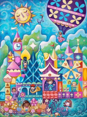 Jerrod Maruyama provides a different take on "it's a small world" with "The Happiest Cruise." It takes the facade of the Disneyland classic and has characters from the attraction appearing in multiple turrets, like the clock parade amplified. "The Happiest Cruise" by Jerrod Maruyama is available on canvas for $295.