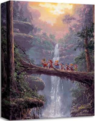 When you first look at "Homeward Bound" by Rodel Gonzalez, it's easy to initially miss the Seven Dwarfs marching home across a log. The brightness of the sky is what attracts my eyes first and it isn't until I look closer at the details that the dwarfs appear. They're easy to miss if you walk past this painting quickly, but become a source of delight as viewers discover them. The piece evokes the beauty and grandeur of nature, as well as the comfort and joys of home. There's also a hidden message of hard work leading to just rewards. "Homeward Bound" by Rodel Gonzalez is available on canvas for $149.95.