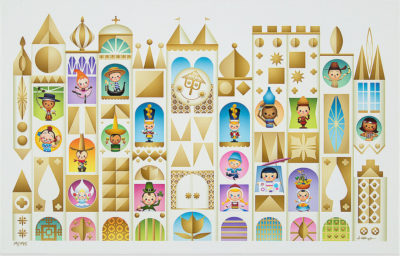 The barriers that divide us are broken down in "Friendship Under One Golden Sun" by Jeremiah Ketner, a tribute to the iconic "it's a small world" attraction. Ketner takes Mary Blair's style and adapts it to his own, with a unique color scheme that both calls Blair to mind, but is quite different than anything she produced. It's a visual mash-up, combining multiple regions and elements from the attraction into one piece, based on the Sherman Brothers lyric "There is just one moon and one golden sun." While the attraction actually features multiple suns, styled for each region, this piece calls to mine the finale of the attraction, represented in glorious Technicolor instead of white and gold. "Friendship Under One Golden Sun" by Jeremiah Ketner is available as a ready-to-frame lithograph for $39.99.
