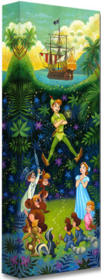 Fans of Mary Blair will appreciate the way Tim Rogerson has captured her whimsical style in "The Hero of Never Land." It's most evident in the tropical wall behind floating Peter Pan, where a dark black base is covered by uniquely styled plants and flowers, all in Blaire's magical colors. Captain Hook's Jolly Rodger is just on the horizon, parked in the lagoon plotting a way to capture Peter Pan. The color of the sky is also a Blaire-ism, an unconventional yellow blue. Disney fans should pay close attention the next time they watch the film to the number of times the sky in Never Land is an unnatural color. Looking closely, there's a trail of pixie dust surrounding Pan from the middle of the Lost Boys/Darling children to his left shoulder where the Pixie hovers next to her hero. "The Hero of Neverland" by Tim Rogerson is available on canvas for $149.95.