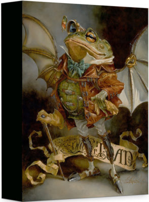 This gallery began with a portrait of Scrooge McDuck and ends with a portrait of another eccentric wealthy animal, J. Thaddeus Toad from Disney's The Adventures of Ichabod & Mr. Toad, as well as the classic Disneyland attraction, Mr. Toad's Wild Ride. He looks much more toadlike in this realistic painting by Heather Theurer, and his different colored eyes suggest that motor mania is just settling in. If McDuck's portrait is fit for his mansion, this one would look dashing anywhere in Toad Hall. And now it can be part of your home gallery as well. "The Insatiable Mr. Toad" by Heather Theurer is available on canvas for $149.95.