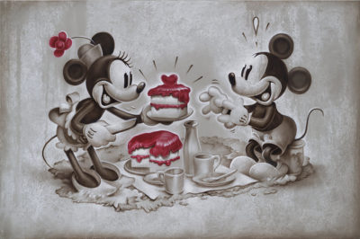 Noah continues to work with one vivid color in "The Way to His Heart," depicting Minnie Mouse serving Mickey Mouse a slice of cake. The entire scene is in black & white, with the exception of the frosting, the flower in Minnie's hat, and the heart shaped icon on top of the piece Minnie is serving to Mickey. With such a sweet scene on display, this would make a perfect Valentine's gift for the love of your life. "The Way to His Heart" by Noah is available in several framed sizes ranging in price from $325 to $675.