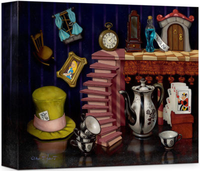 Clinton Hobart's pieces reflect timeless Disney classics as real objects. "Things from Wonderland" collects objects from Alice in Wonderland and displays them all at once. Part of the fun is the varying size of the objects. For example, the Mad Hatter's hat, which we know to be quite large, is not much bigger than the White Rabbit's watch, and appears to be about as tall as the "Drink Me" vial next to the door (with Doorknob). Things are never what they seem in Wonderland, which is perfectly captured here. "Things from Wonderland" by Clinton Hobart is available on canvas for $149.95.