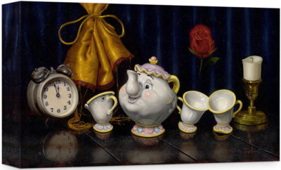 Like "Things from Wonderland," "Time for Tea" by Clinton Hobart adapts Beauty and the Beast as ordinary household items. At first glance, it appears to be just a painting of Mrs. Potts and Chip, until you realize that they are reflective porcelain, not made of Disneyite, and their poses appear fixed forever. On the same tabletop is a candle, alarm clock, and a simple red rose. To me, it evokes both joy and sorrow, a table of disenchanted objects. "Time for Tea" by Clinton Hobart is available on canvas for $149.95.