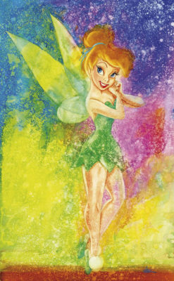 The feisty fairy is having a demure moment in this piece by Randy Noble. Often likened to the beauty of Marilyn Monroe, Tinker Bell is a fitting subject for any work of art. But what speaks to me the most about this piece is the clash of colors behind her. For years, Tinker Bell greeted television viewers every week on the Disney serial program and during the majority of its time on TV, from The Wonderful World of Color onward, she would fly in and use her magic wand to ignite firework splashes of color. When I look at this piece, I think of Tinker Bell landing after causing such an explosion, the beautiful aftermath settling around her and a look of satisfaction in a job well done in her expression. "Tinker Bell" by Randy Noble is available on canvas or printed with a variety of framing options between $120 and $175.
