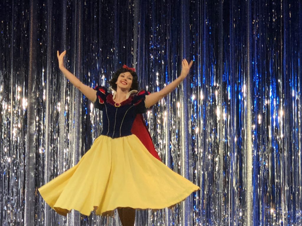 As a preshow, Snow White takes the stage and dances to "Some Day My Prince Will Come," before thanking everyone for coming to celebrate. She made a point to mention the dazzling restoration the film received before the film began.