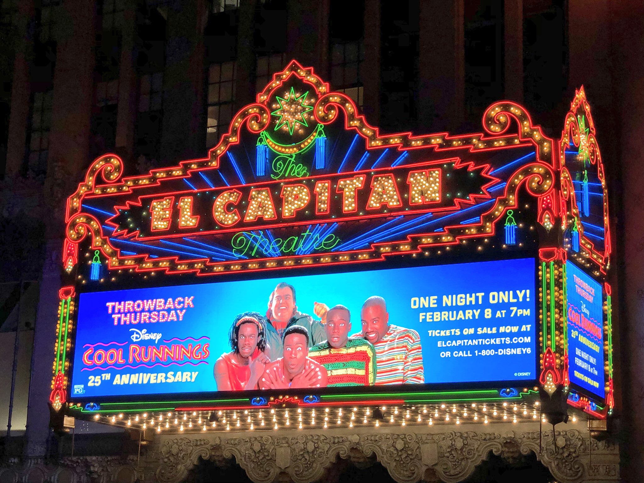 On February 8th, the day before the official start of the 2018 Winter Olympics, the El Capitan Theatre hosted a very special Throwback Thursday screening. To kick off the Olympics celebration in Hollywood, they paid tribute to the 25th anniversary of Cool Runnings, an underdog film released in 1993 based on a true story. The evening promised a few special guests in addition to the rare chance to see the film back on the big screen.